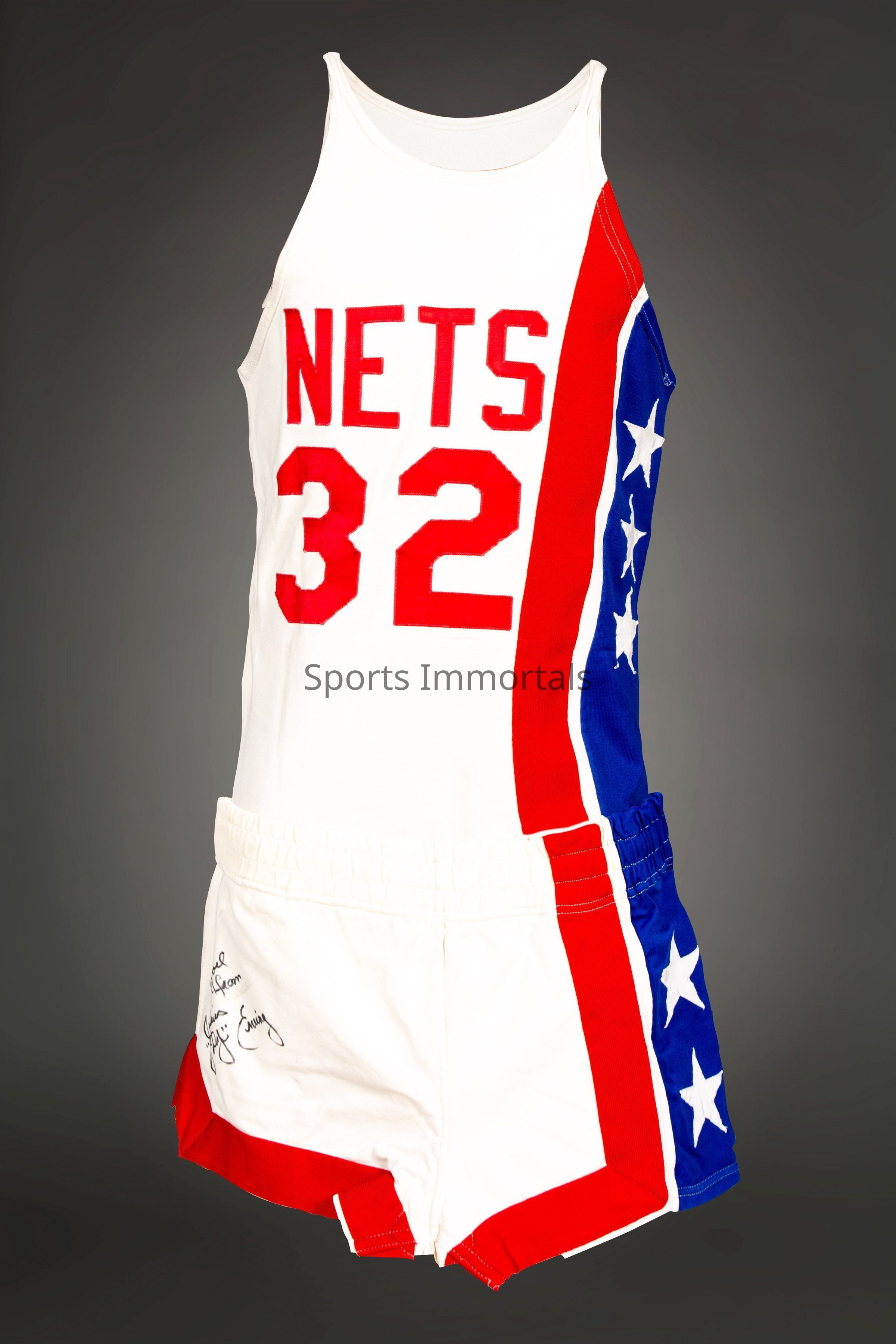 Photo matched complete ABA Nets game used uniform (#32), ; Shorts are signed by Dr. J "To Joel from Julius "Dr. J" Erving"