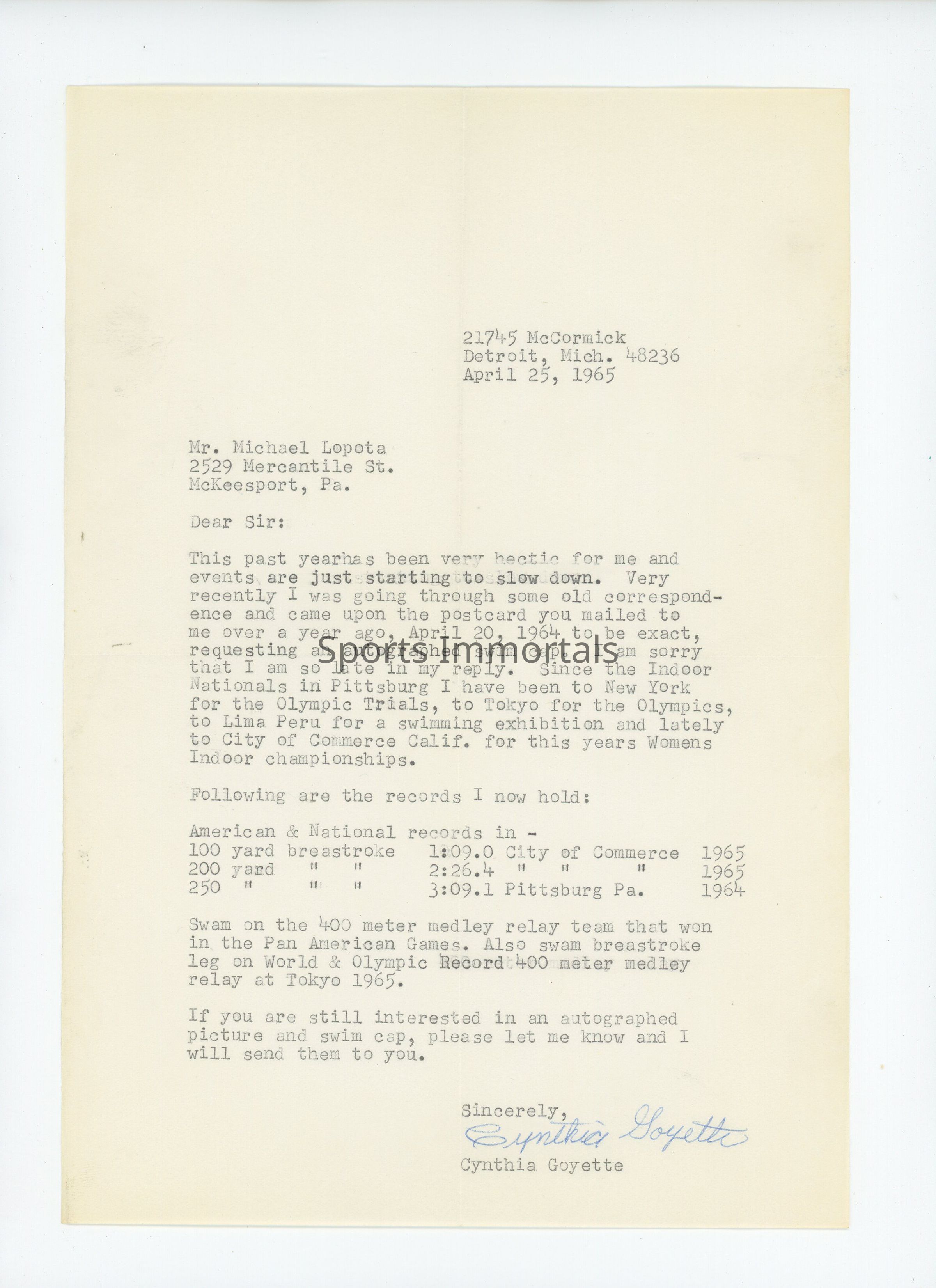 Autographed Small Photo And Letter...Won Gold Medal In 1964 Olympics, Tokyo