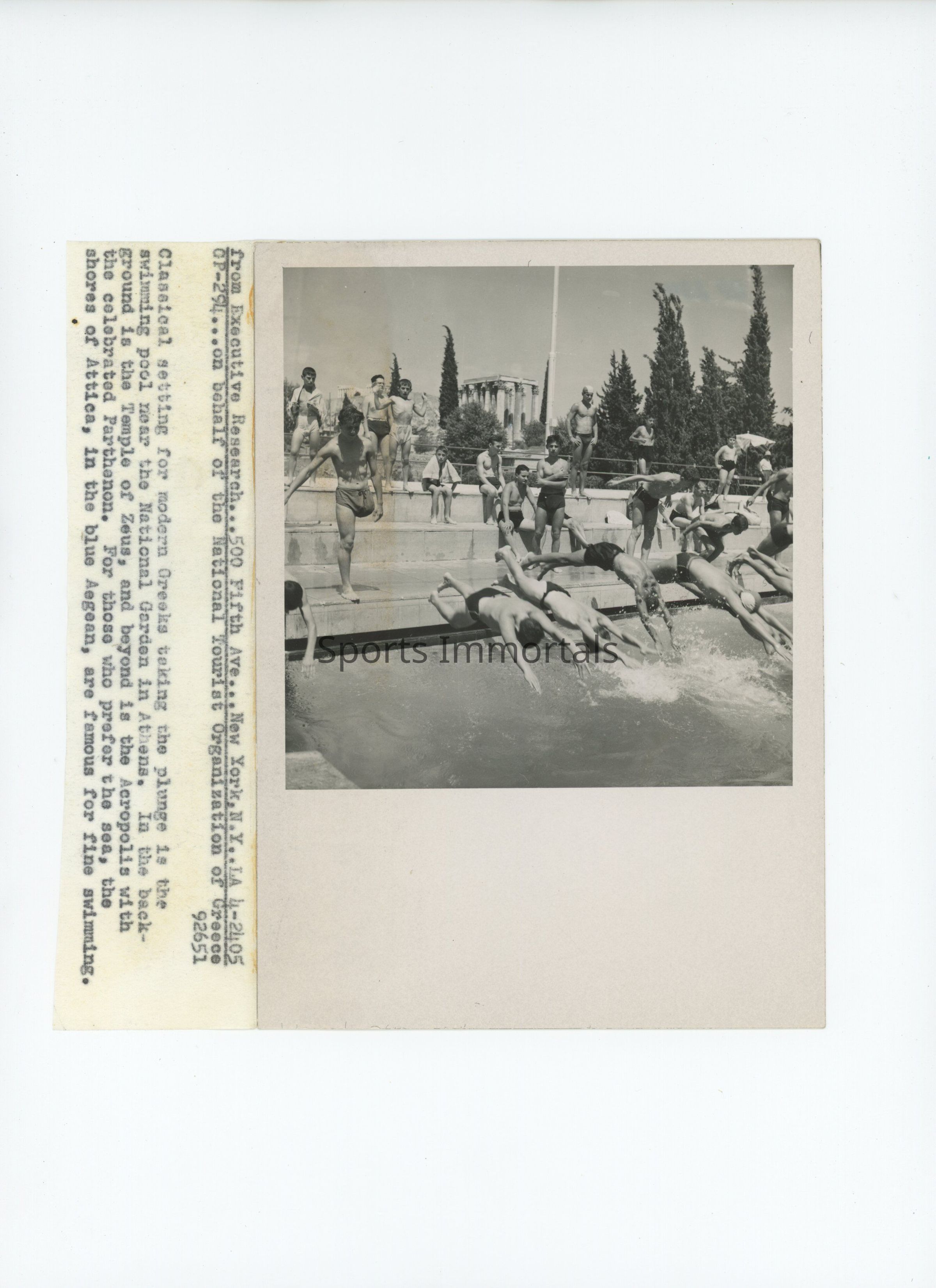 Small Photo Of Swimmers Diving Into Pool With Temple Of Zeus In Background