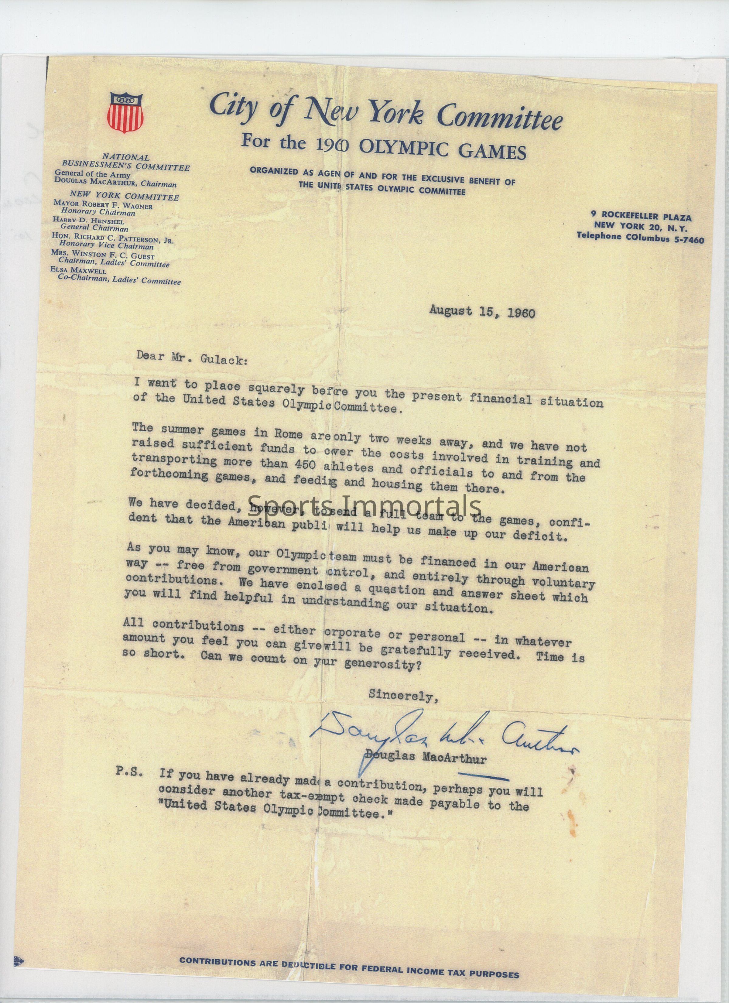 Copy of letter from Douglas MacArthur requesting donation for the 1960 Olympic games