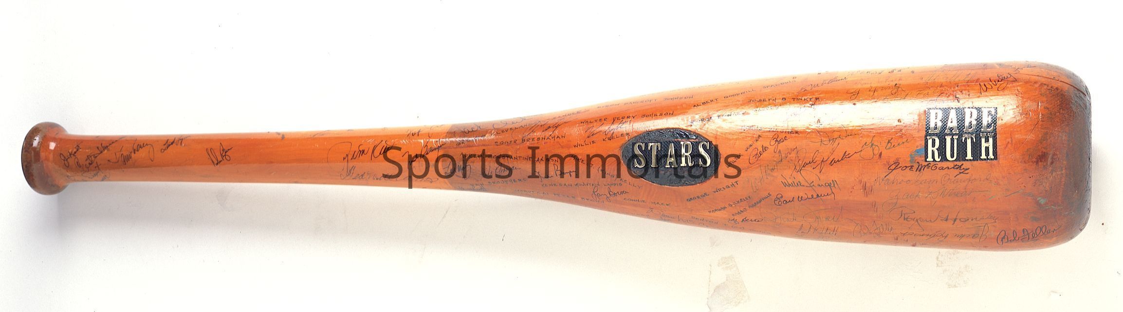 Oversized 1 of a kind autographed bat signed by over 100 hall of fame greats including Crawford, Feller, Stargell, Ford, Vance, Dean, Gibson, Matthews, Young, Cobb, Hornsby, Clemente, Etc. Could be most valuable multi autographed bat in existence