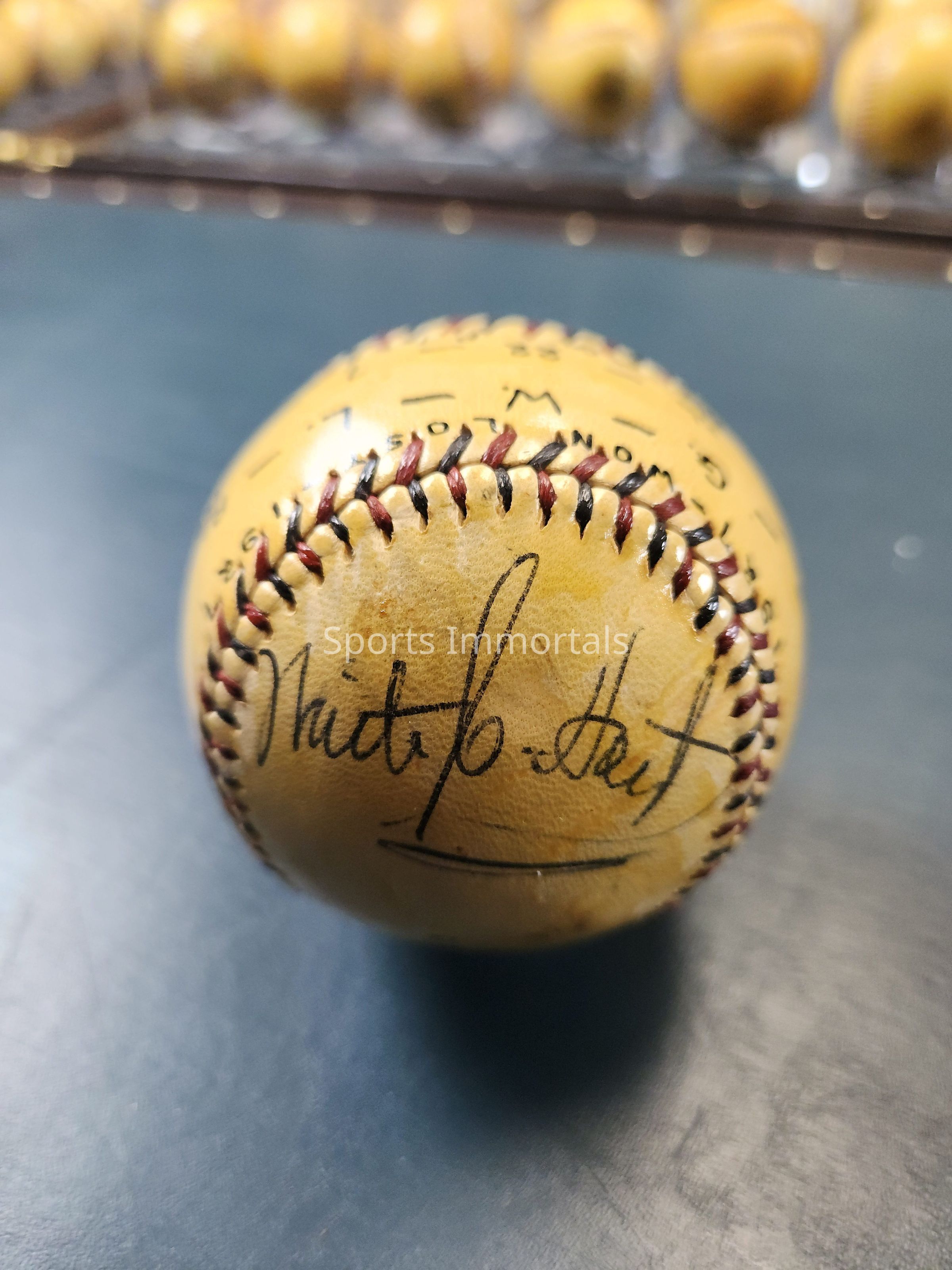 Autographed Baseball with statistics from 1927 on it