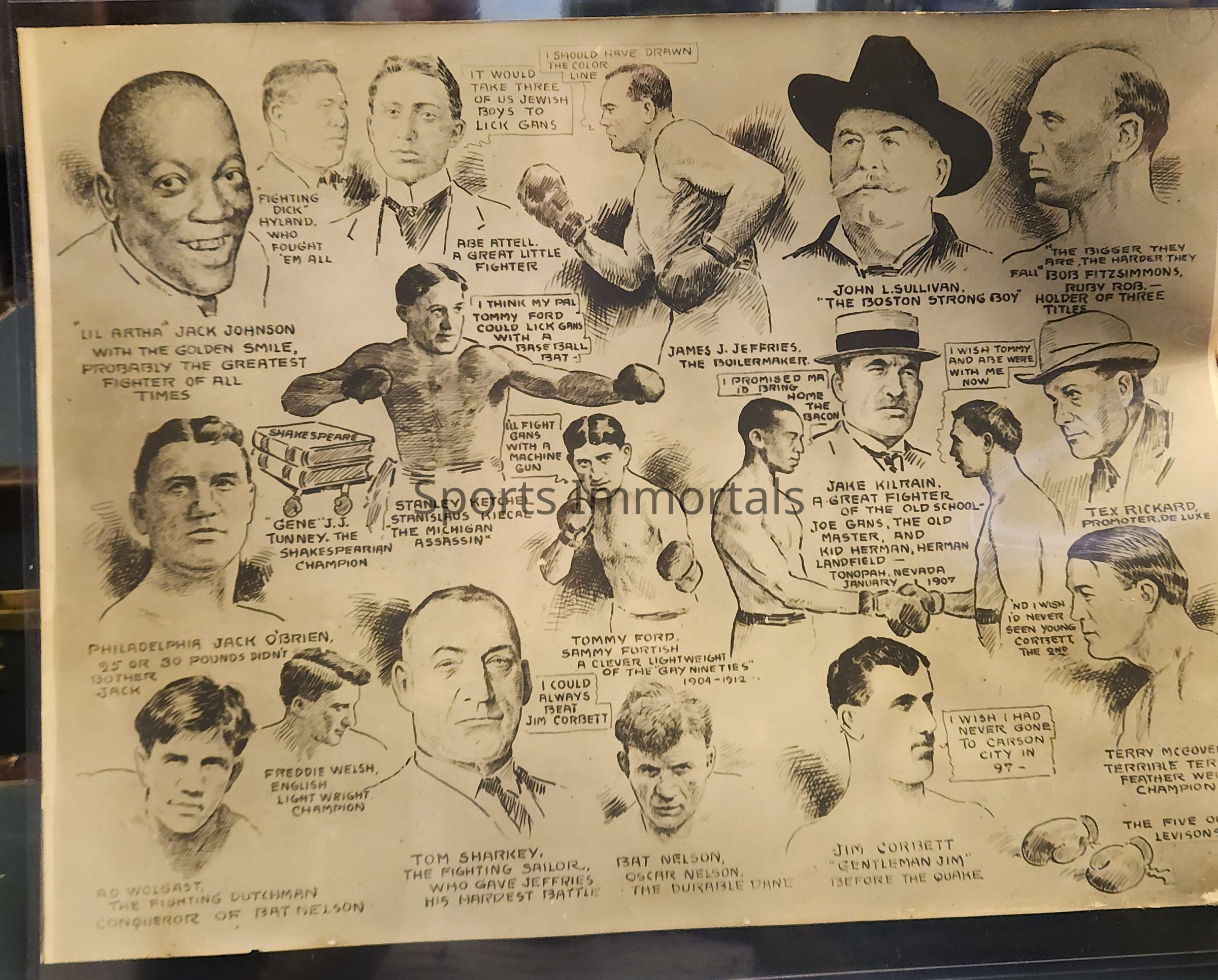 Johnson, Jack; Abe Attell, James J. Jeffries, John L. Sullivan, Bob Fitzsimmons, Gene Tunney, Stanley Ketchel, Tommy Ford, Jake Kilrain, Tex Rickard, Jack O'Brien, Jim Corbett, Freddie Welsh, Ad Wolgast, Tom Sharkey, Battling Nelson and Terry McGovernDescription