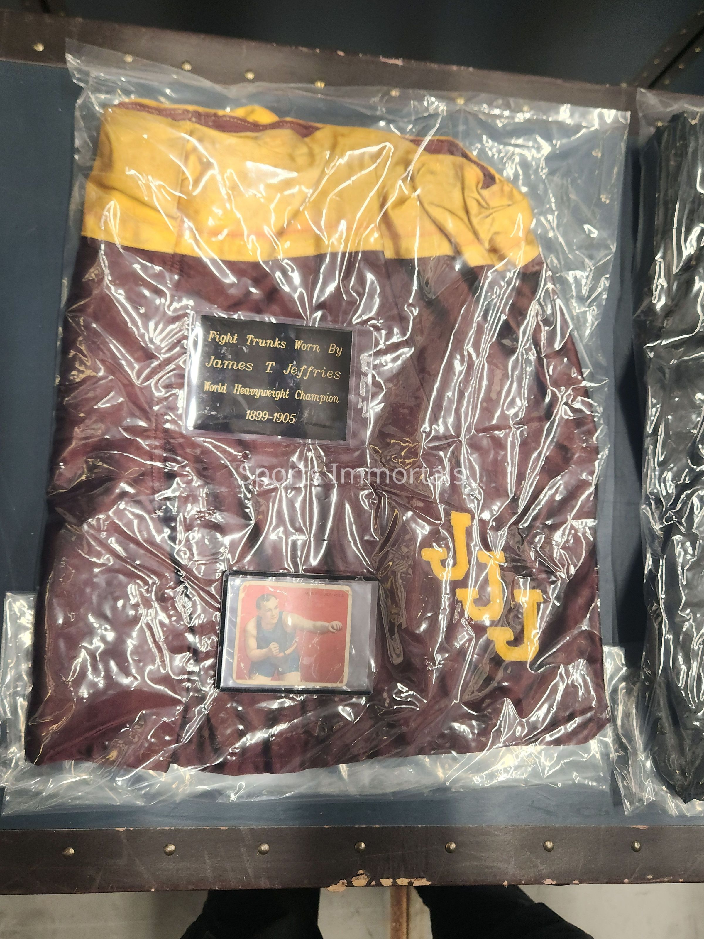 Montage Containing Photo Of Fight, Article, Johnson Photo With Cut Autograph, Jeffries Fight Worn Trunks (Not From Johnson Fight), Original Fight Ticket, And Two Cards Showing Fighters (taken out of frame)