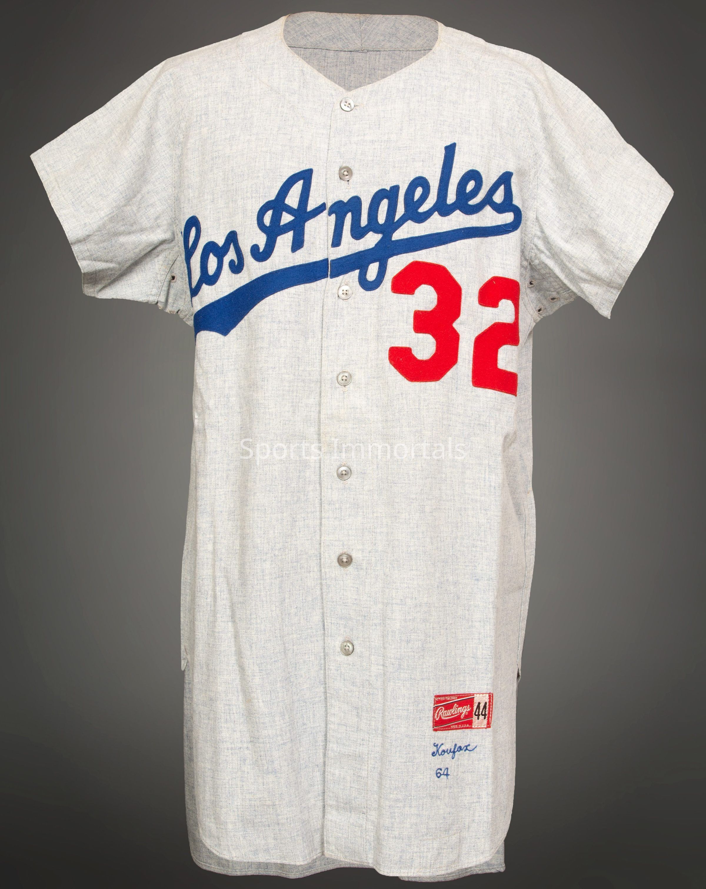 Sandy Koufax 1964 grey Rawlings size 44 game used jersey. "Koufax" and "64" are stitched on the bottom of the jersey. Jersey was photo matched to a spring training game in 1975.