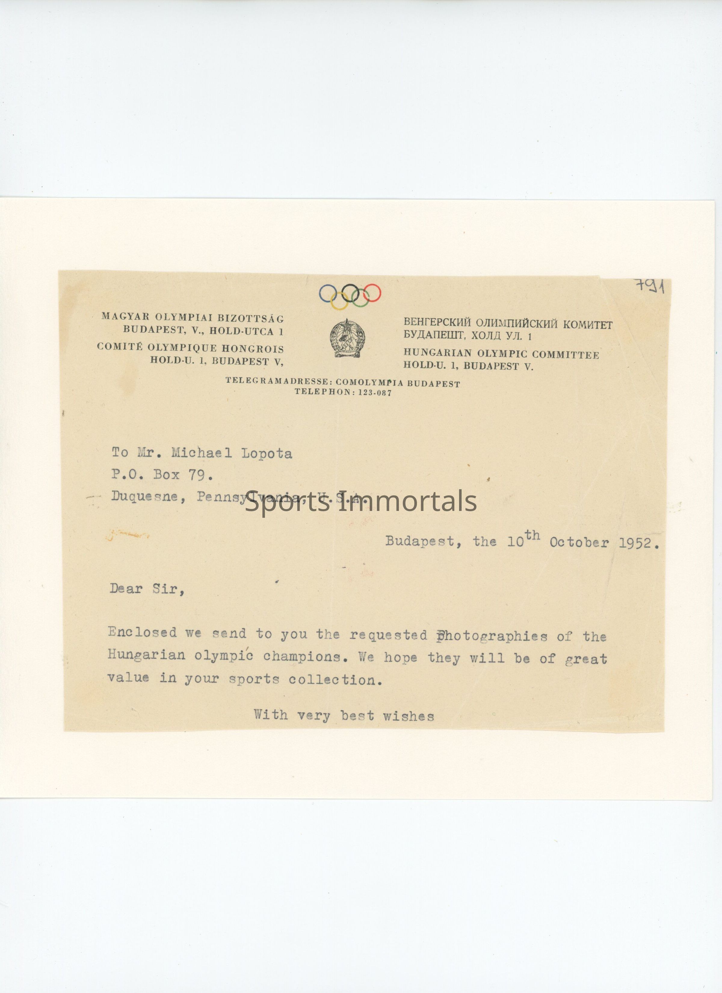 Letter to Lopota from Hungarian Olympic Office in 1952