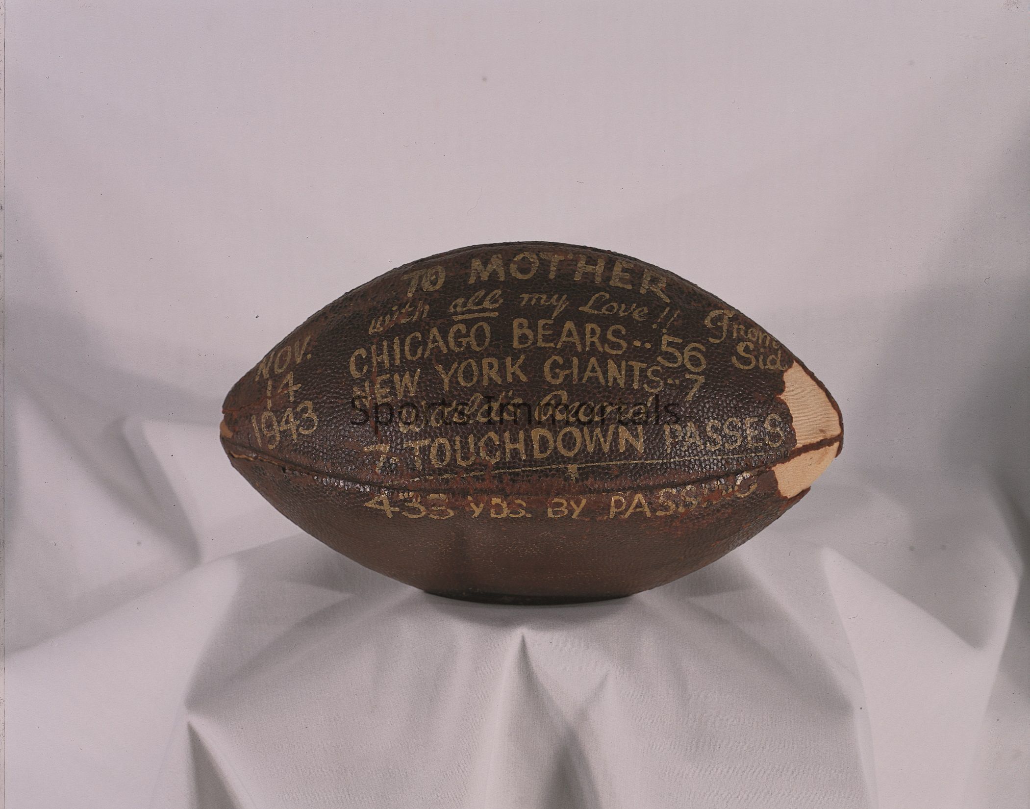 Football that Luckman used in game against New York Giants on November 14, 1943. During this game, Sid set the record by throwing 7 touchdown passes - It was first professional game that Luckman's mother ever attended. He dedicated the ball to his mother after the game and signed it "To Mother With All My Love! Bears 56 - Giants 7. World's Record 7 Touchdown Passes. 433 Yards By Passing. From Sid"