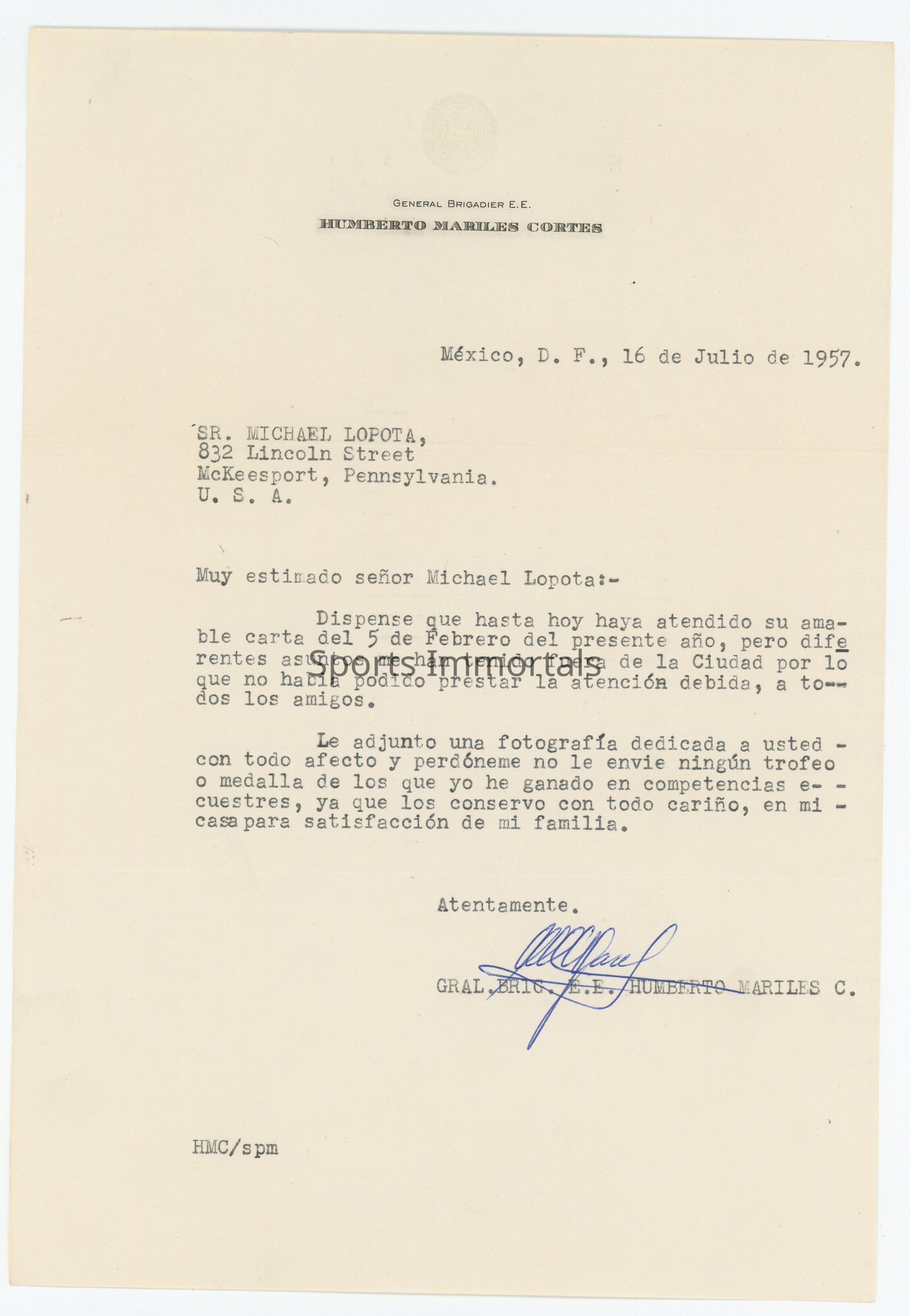 Signed Letter And Photo With Autograph With Salutation In Spanish To Lopota From Mexican Equestrian Star Won 2 Gold In 1948 Olympics