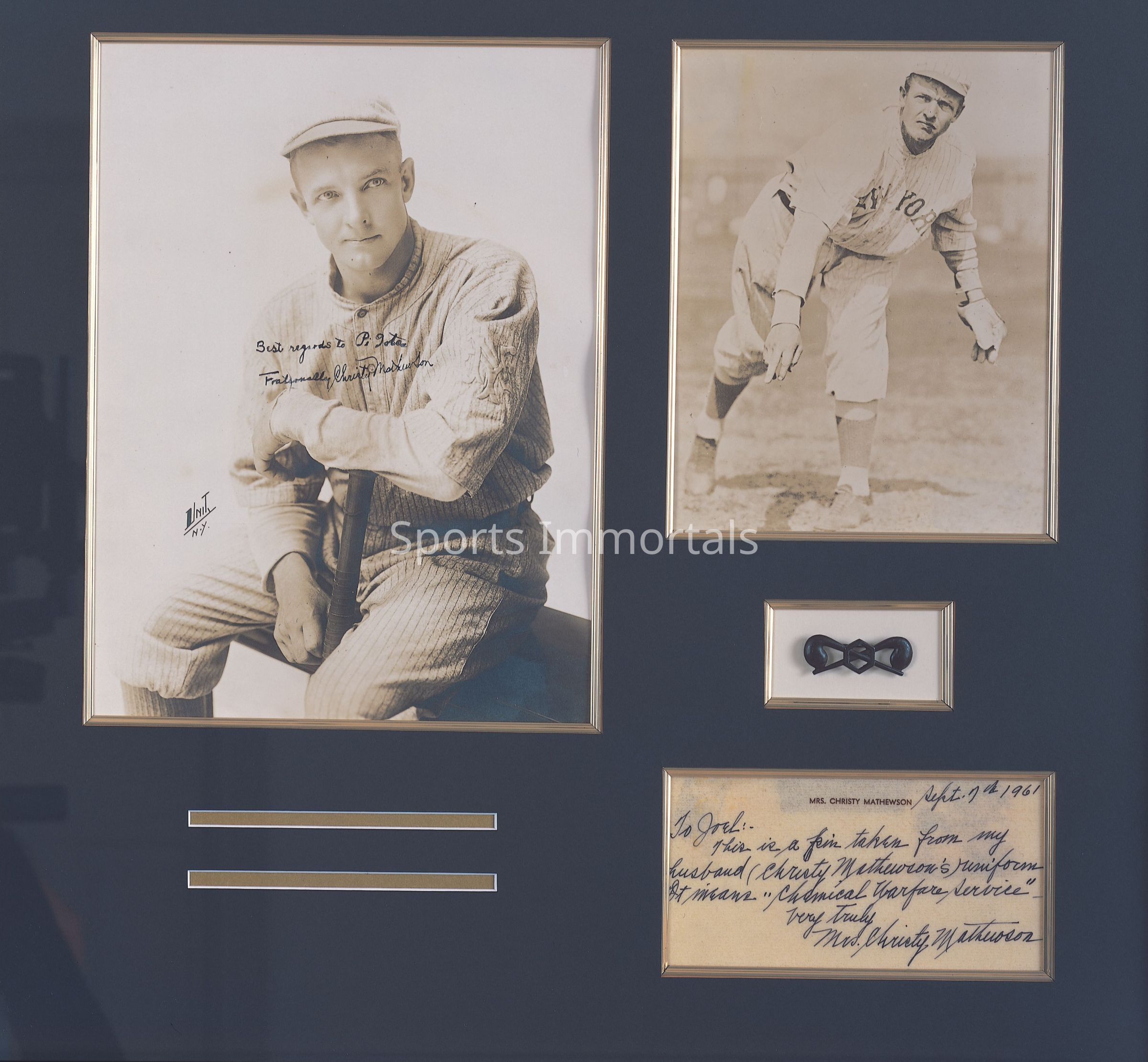 Rare Christy Mathewson autographed photo signed "Fraternally Yours" along with a chemical warfare medal that was removed from Christy's lapel by his wife just before they closed his casket. Mrs. Mathewson mentioned the photo was the last one he ever signed