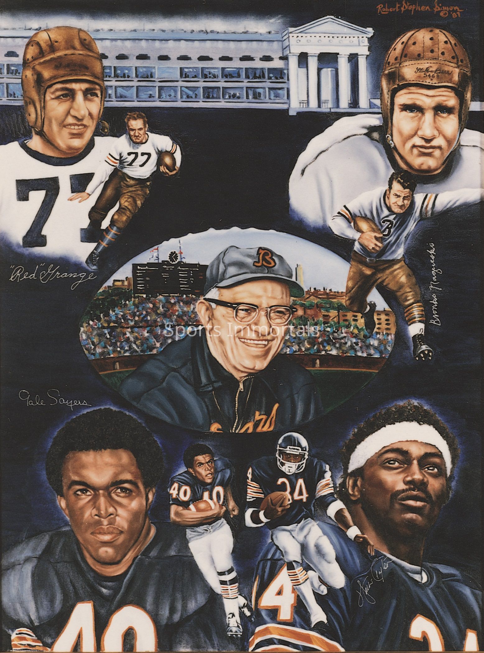 Robert Stephen Simon original artwork depicting Chicago Bears legendary running backs; Bronko Nagurski, Red Grange, Gayle Sayers and Walter Payton. All four legends signed the painting. Only artifact in existence signed by all 4.