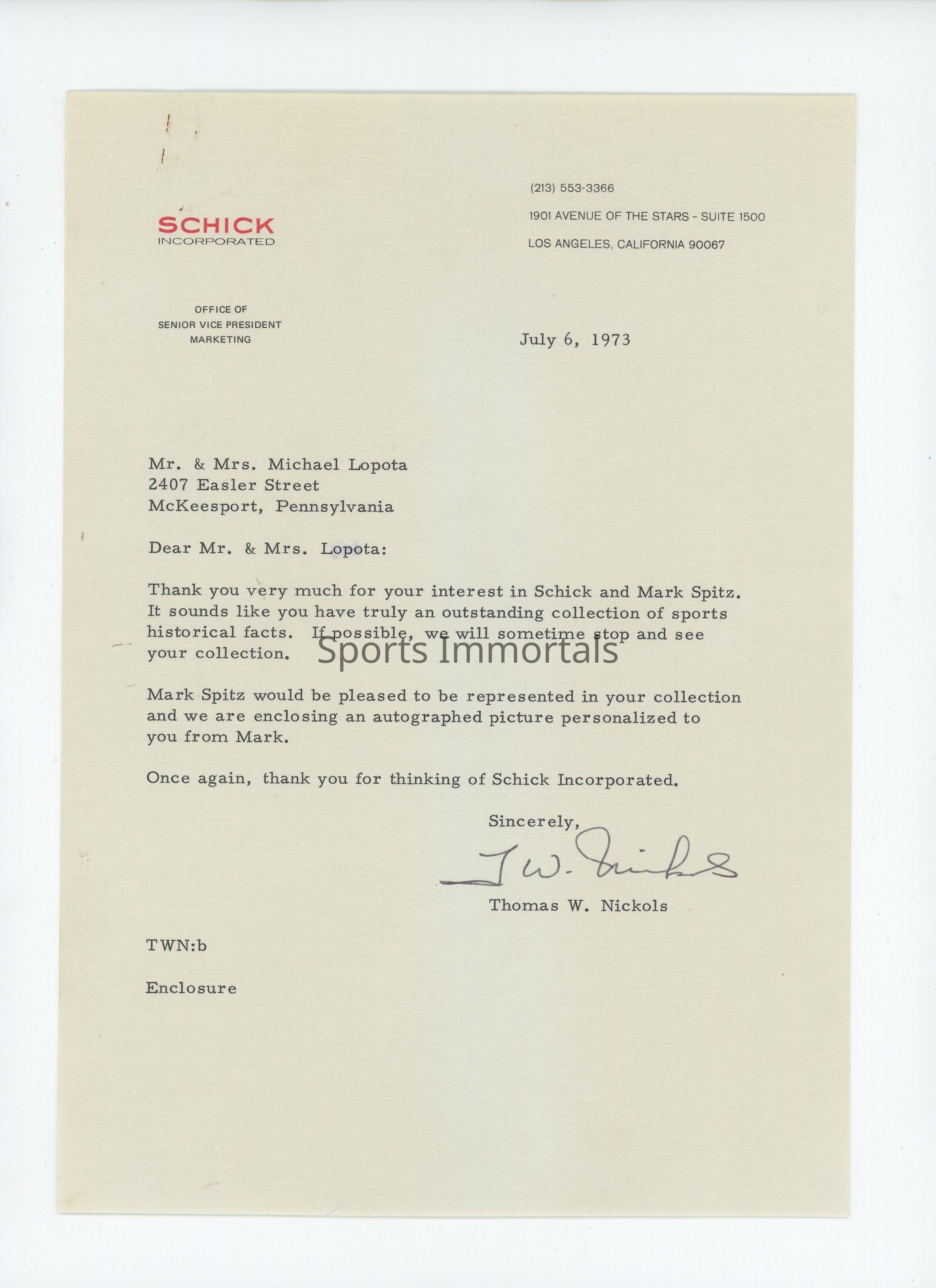 Letter To Lopota From Sr. Vp Of Marketing Of Schick Stating He Is Sending A Signed Photo Of Mark Spitz