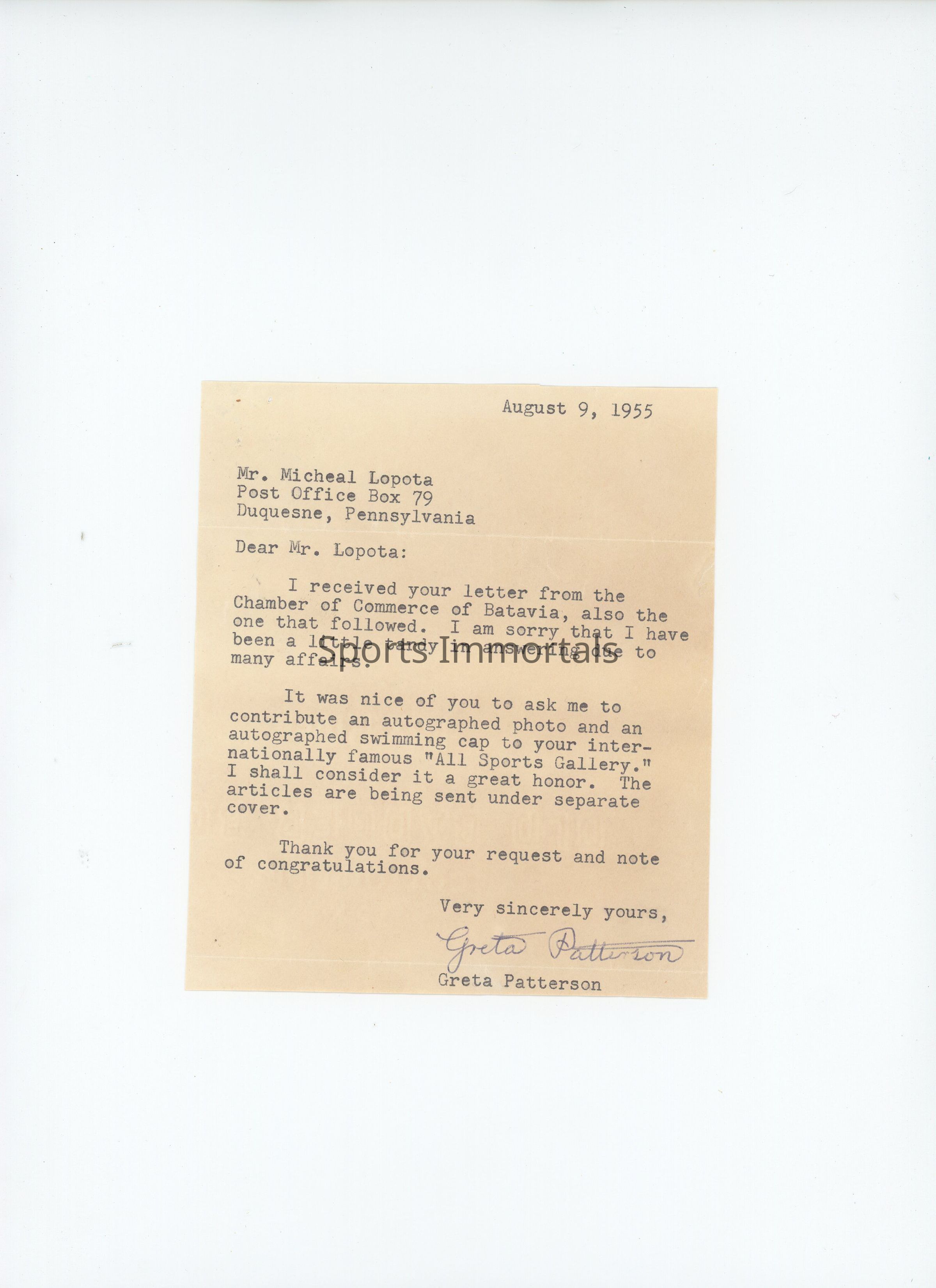 Signed Letter From 1955 The Year Patterson Swam Across Lake Erie
