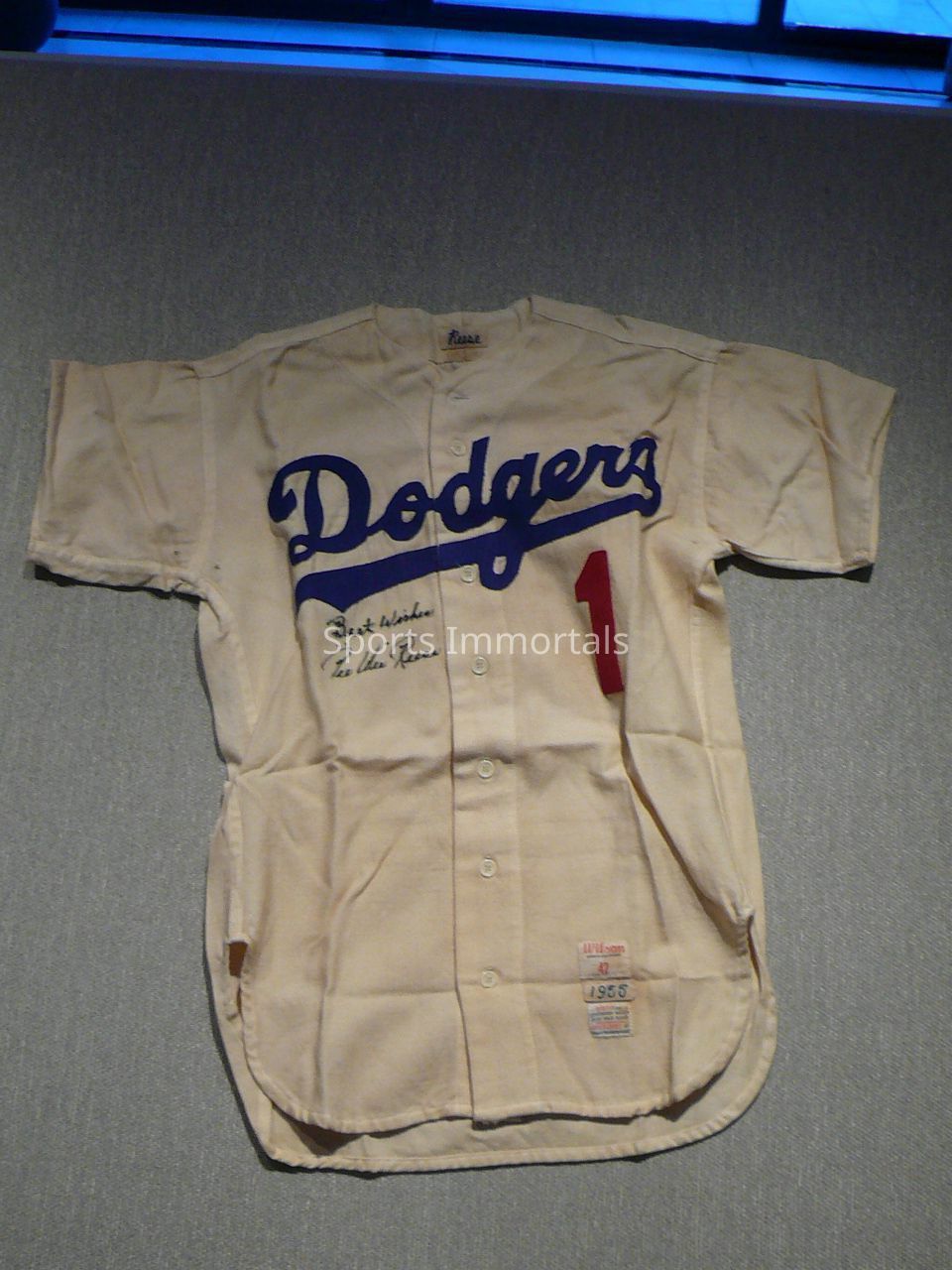 1955 Wilson Size (42) White Jersey. Reese In Collar. #1. Signed "Best Wishes". Dodgers Won World Series In 1955