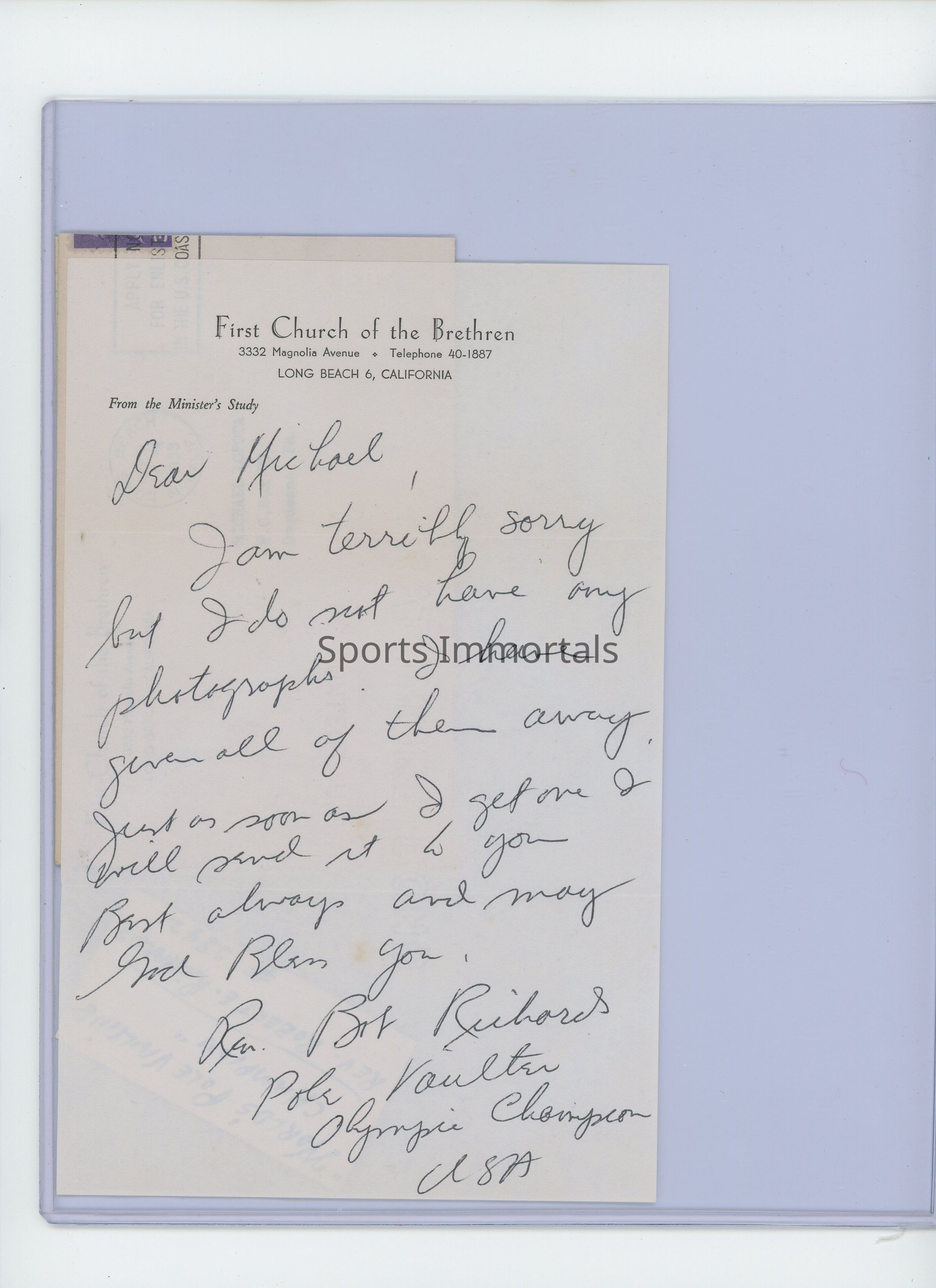 Letter And Photo From Legendary Pole Vaulter Who Won Gold In Helsinki '52 And Melbourne '56 And Bronze In London '48