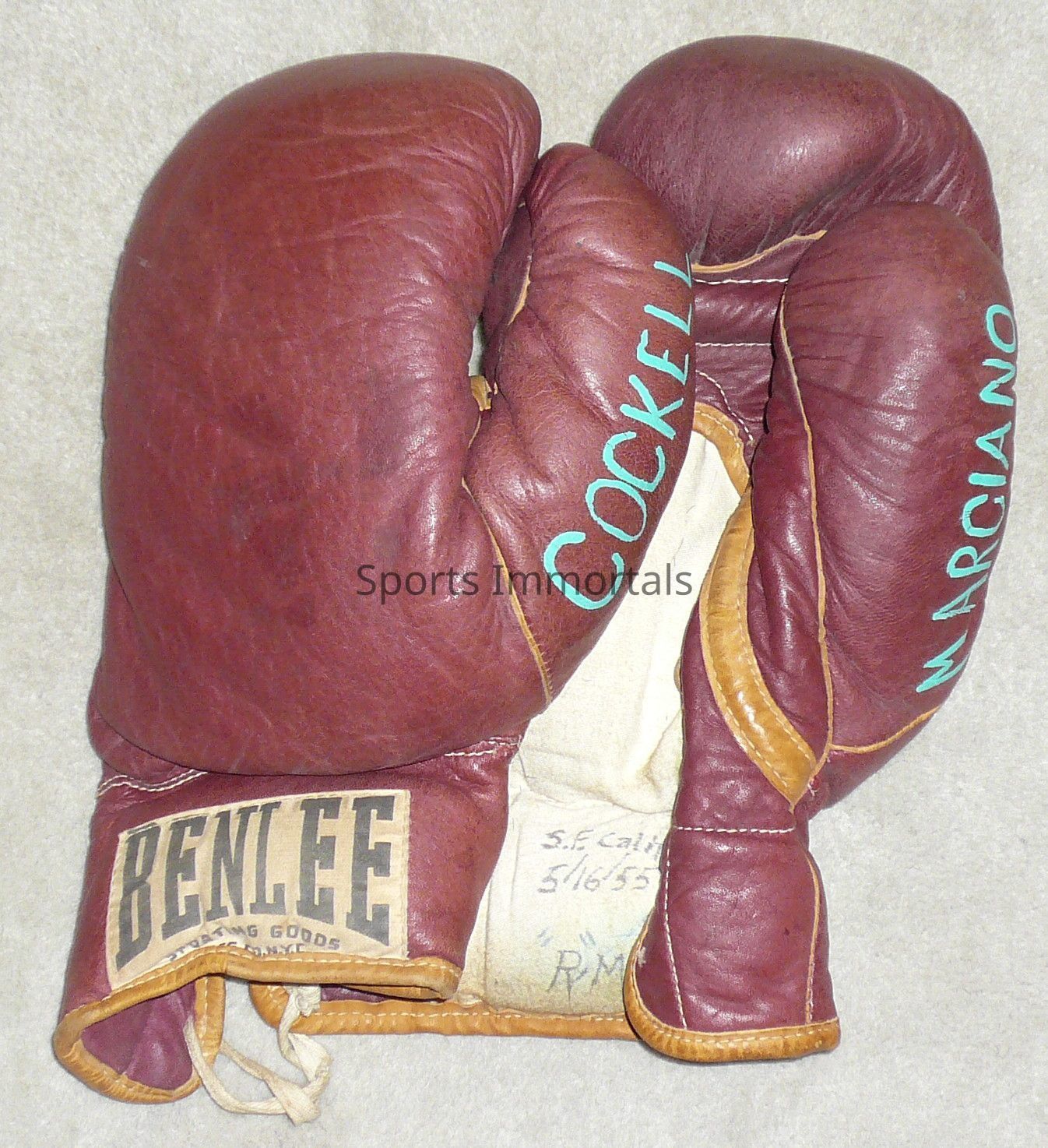 Rocky Marciano fight worn gloves from his fight against Don Cockell on May 16, 1955. The inside of gloves have inscribed "S.F. California, 5/16/55, 'R.M."
