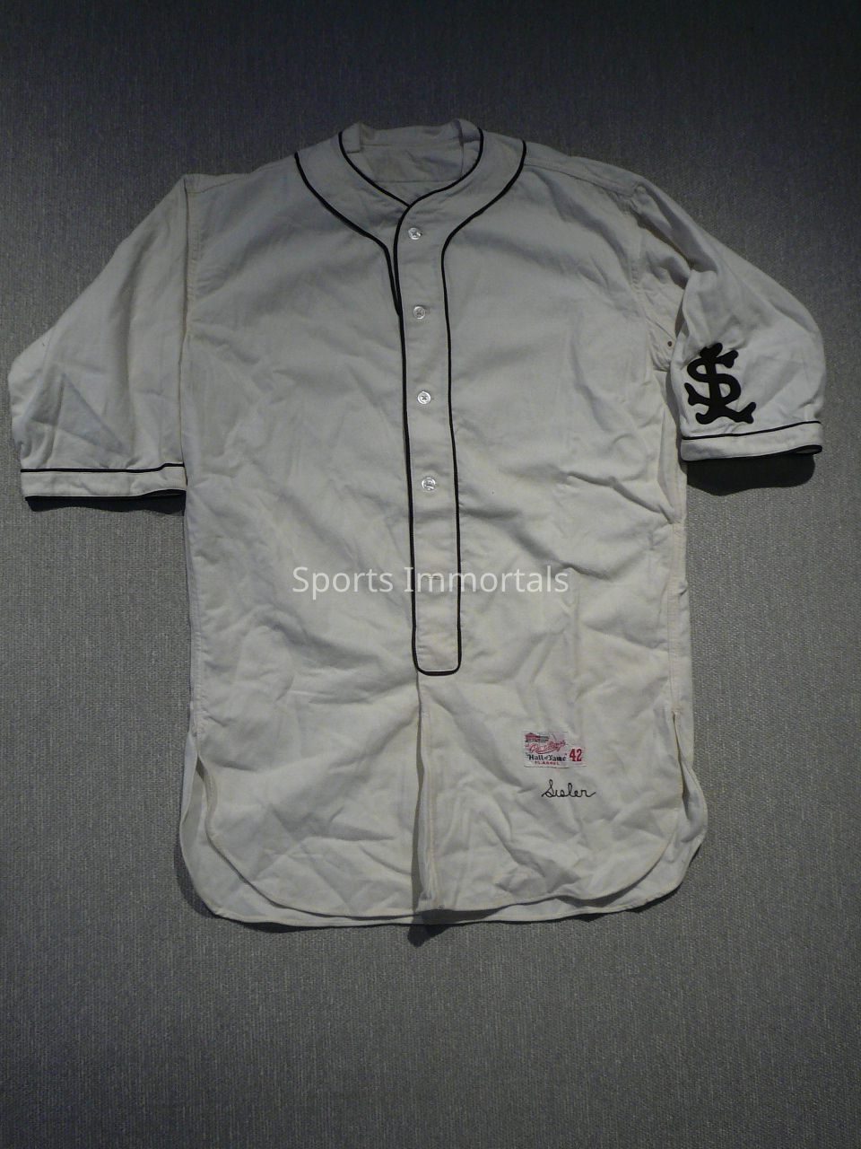 Rawling Hall Of Fame Flannel (42) Uniform. Sisler Stitch On Bottom Right. No Number. Jersey Worn In Old Timers Game In Yankee Stadium With Letter From Sisler Authenticating It.