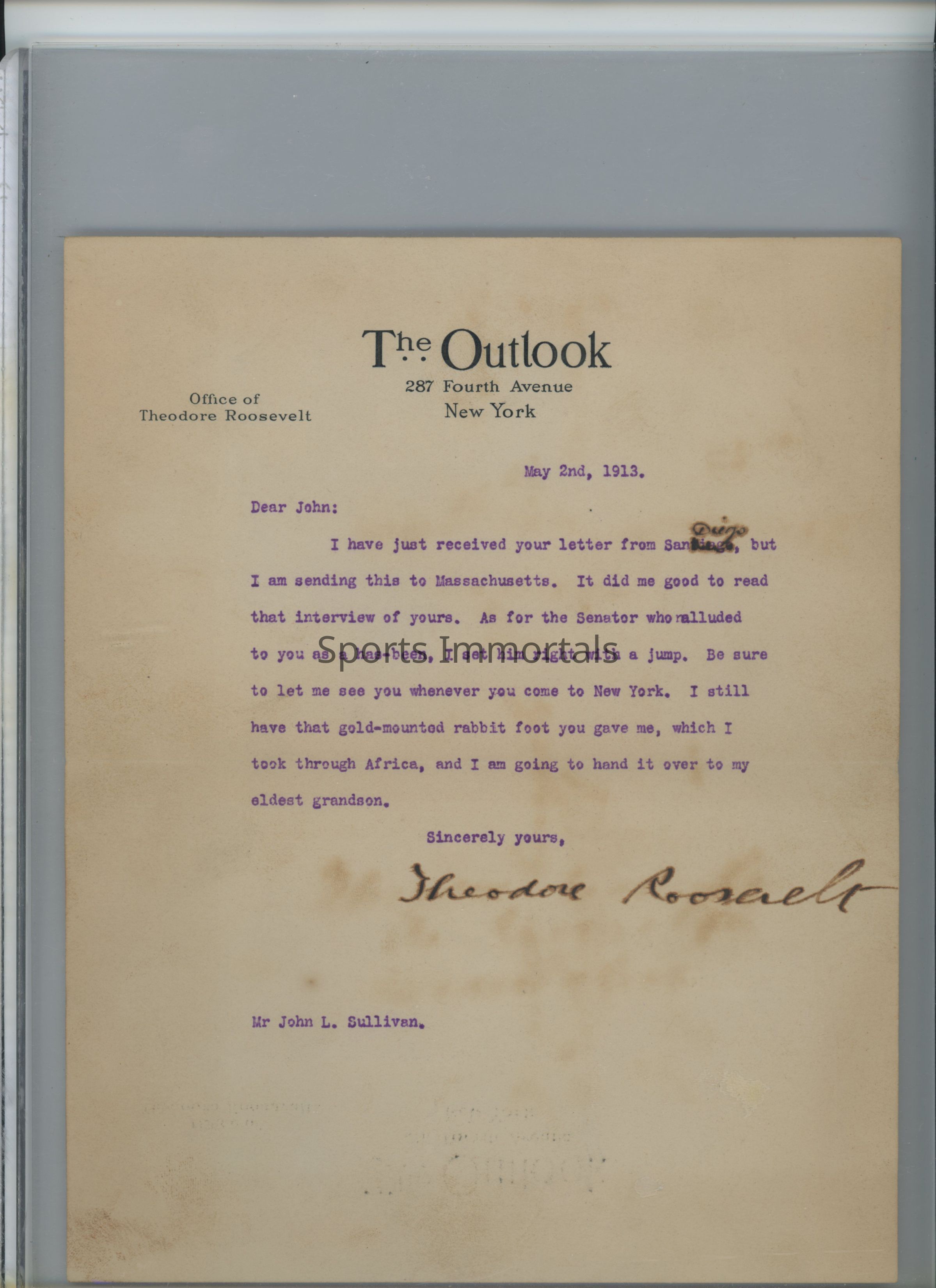 Letter From Roosevelt To Sullivan Commenting On A Senator Who Called Sullivan A "Has Been".