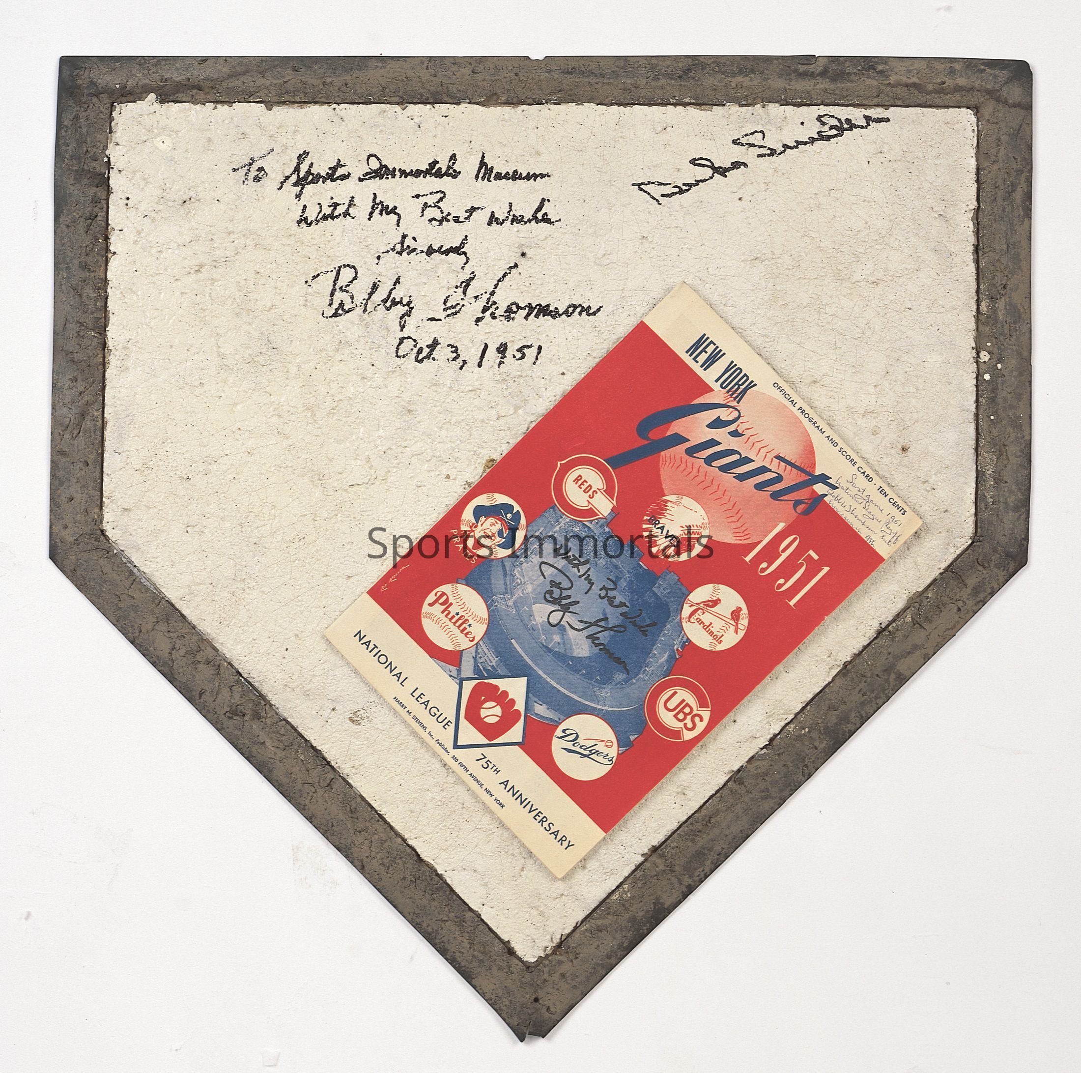 1951 home plate that Bobby Thomson crossed after hitting his historic home run "Shot Heard Around The World" against the Brooklyn Dodgers in 1951 to win NL Pennant for New York Giants. It is signed and dated by Thomson and Duke Snyder, who played on the Dodgers.