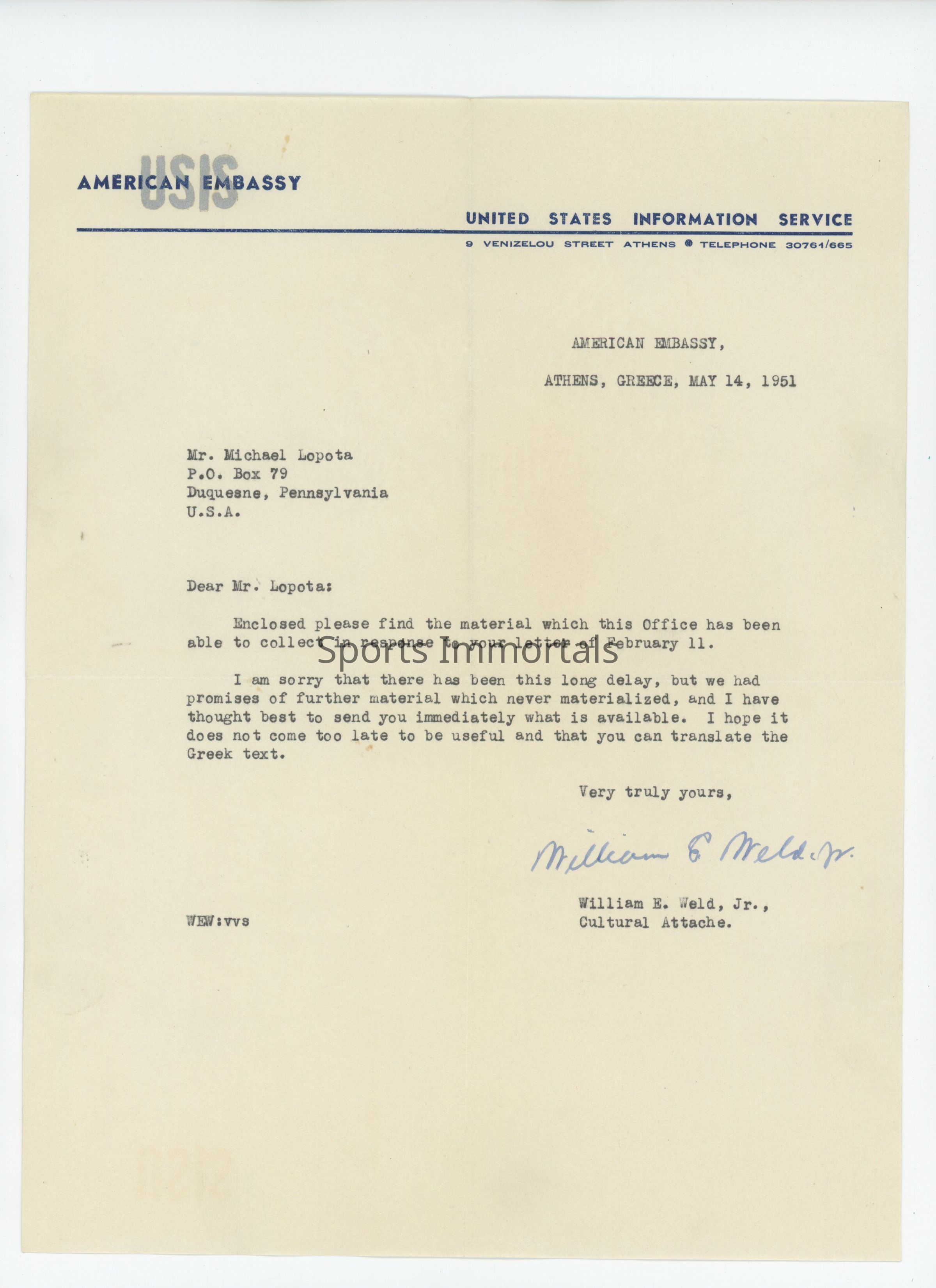 Letter From Cultural Attache From Us Embassy In Greece