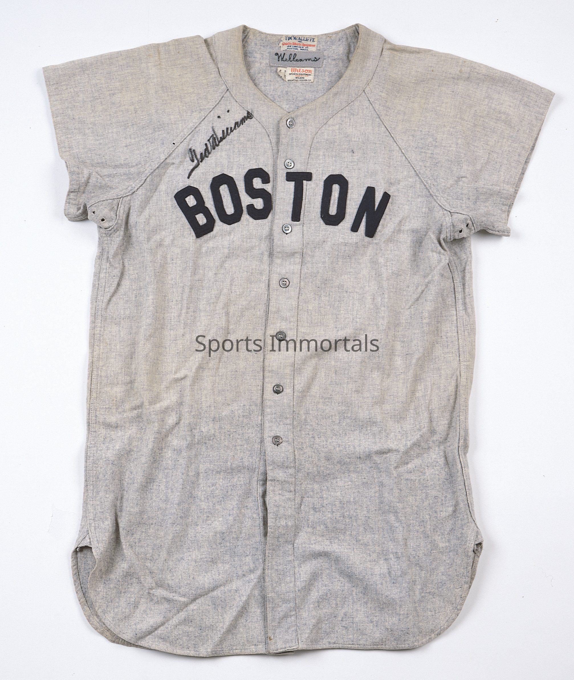 Ted Williams autographed game used jersey with baseball card. Jersey is photo matched to 1949 All Star Game