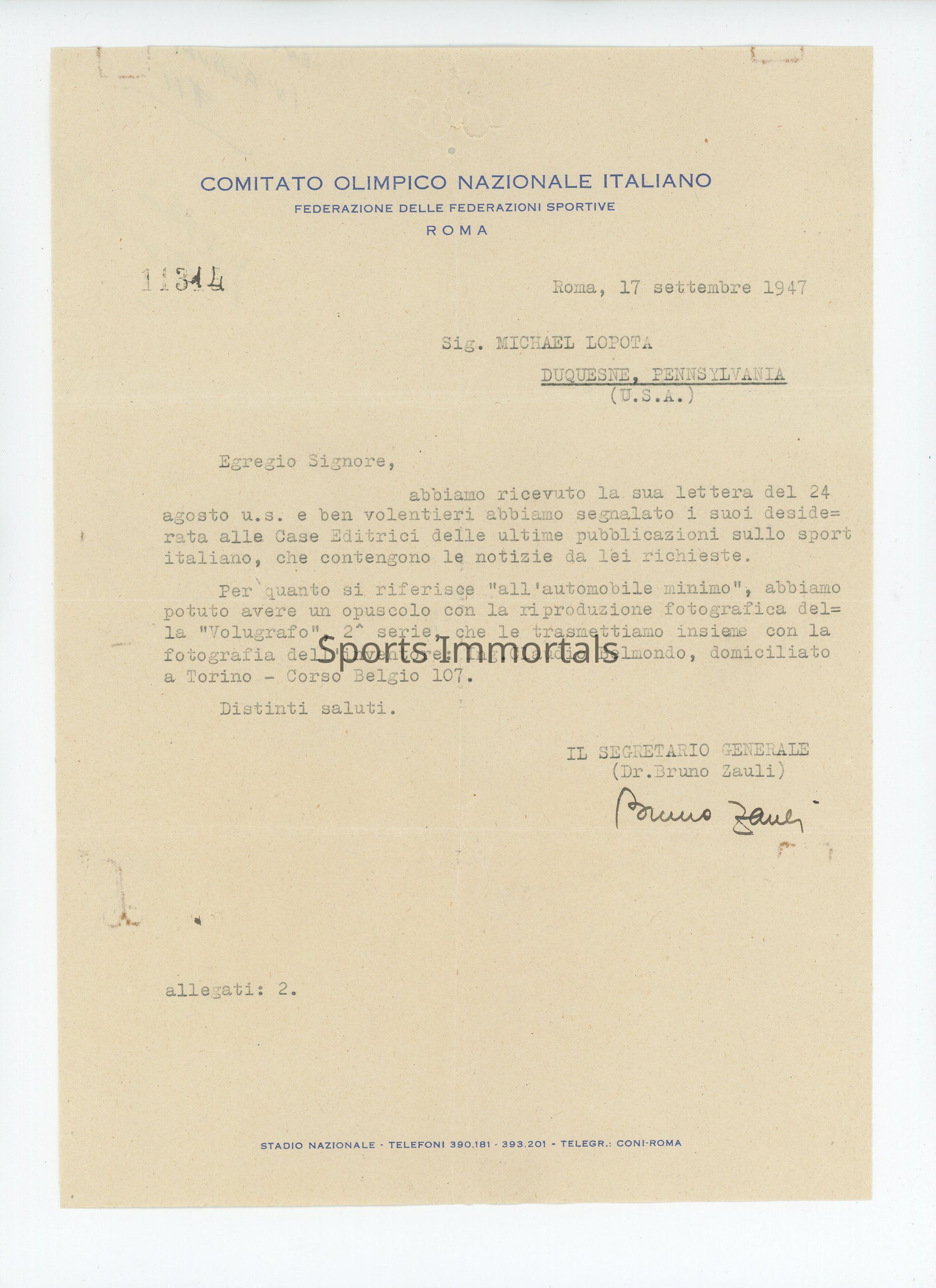 1947 Signed Letter From The Secretary General Of The Italian Olympic Committee