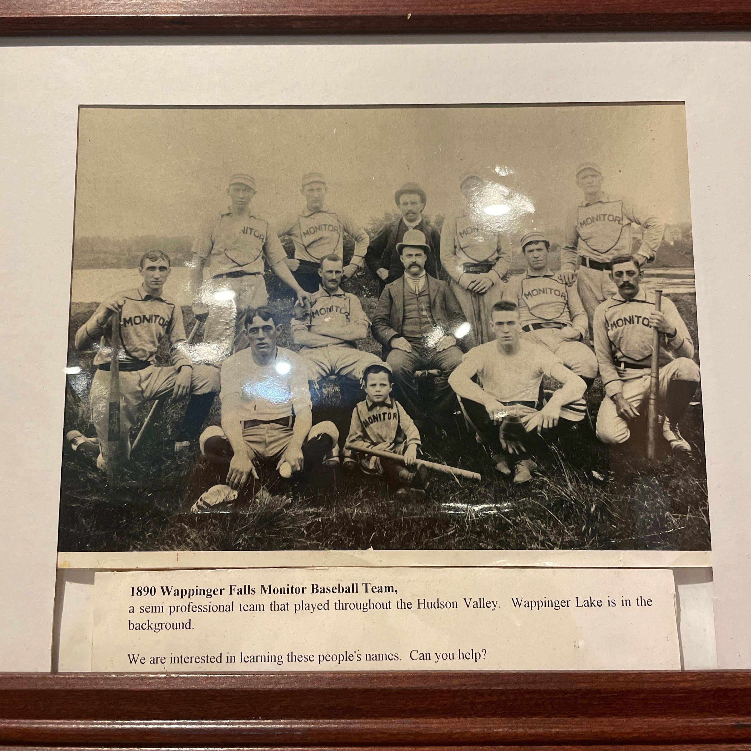 Framed black and white photograph of the 1890 Wappinger Falls Monitor baseball team with Wappinger Lake in the background.