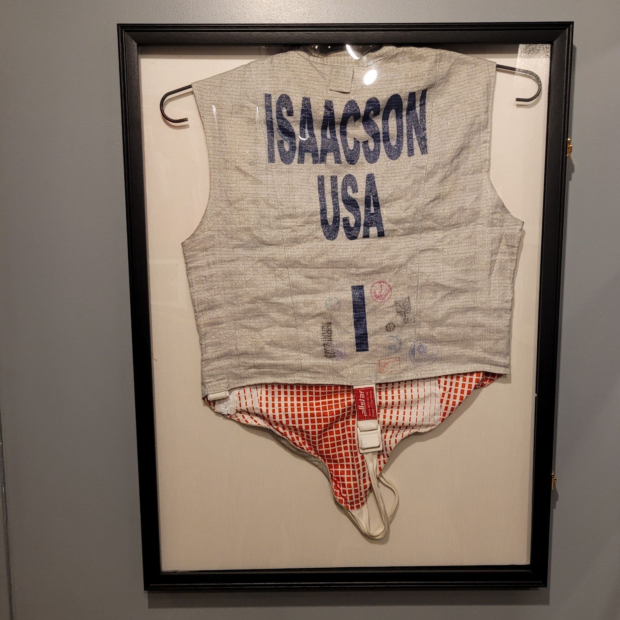 A fencing lamé, a jacket used to register touches during a bout. Worn by Victoria Isaacson.