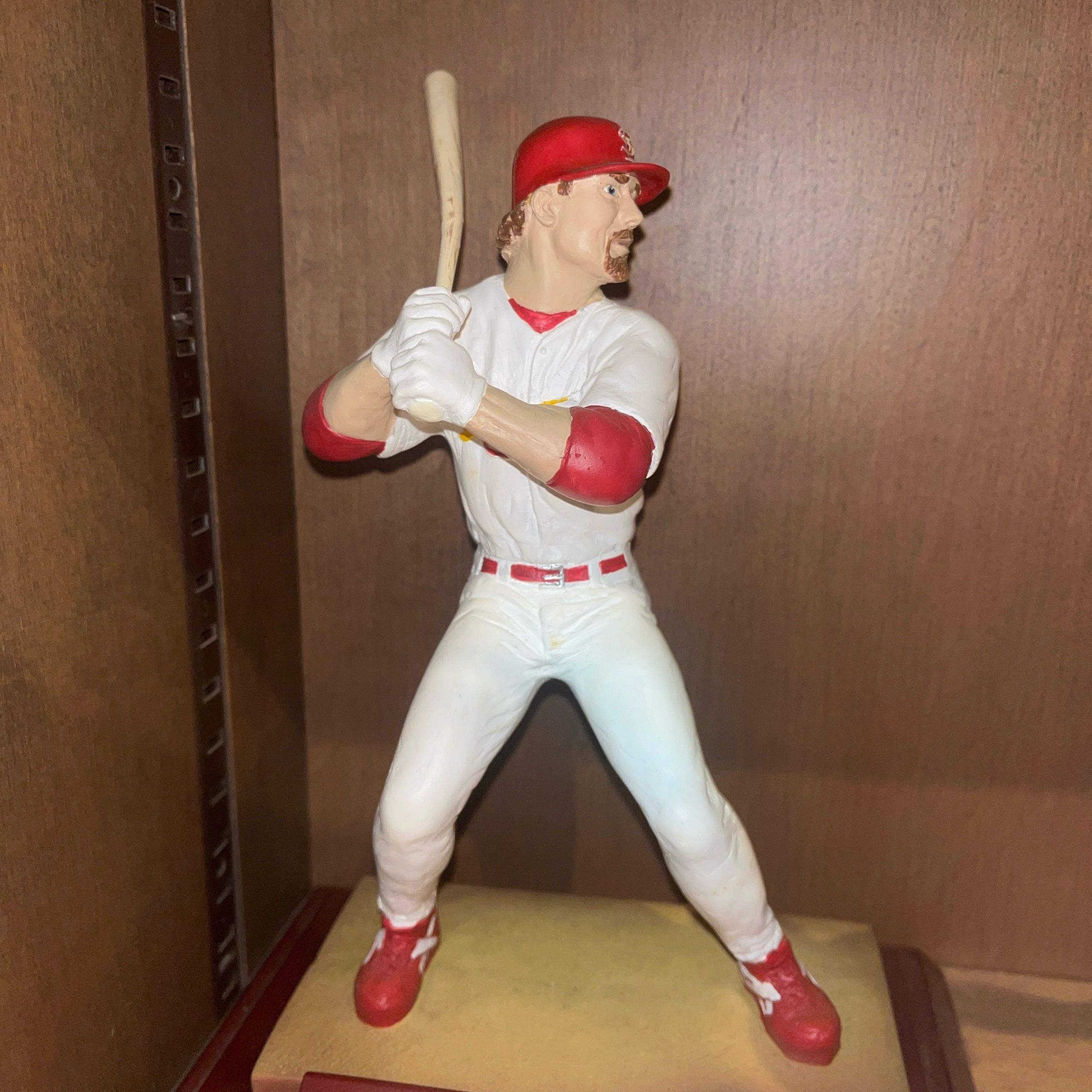 This is a Mark McGwire Salvino Heroes of Yesterday & Today figurine. The statue honors the baseball player's achievements and was produced as a limited edition collectible for fans of the St. Louis Cardinals and MLB memorabilia. It is made of cold cast porcelain and stands approximately 8.5 inches tall.Collection