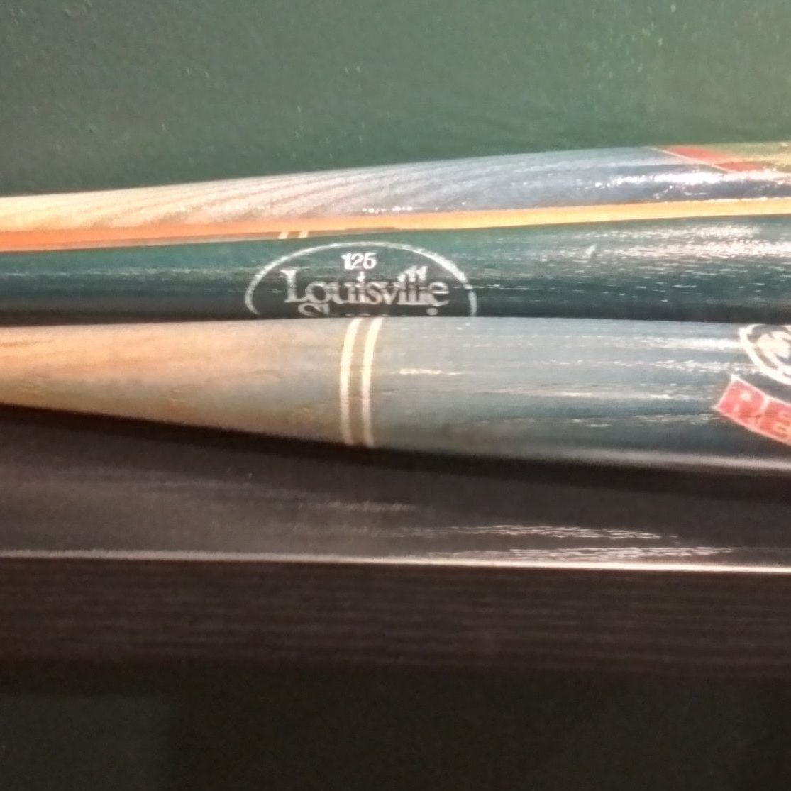 Collection of baseball bat's from different teams throughout throughout the years, including the Hudson Valley Renegades.