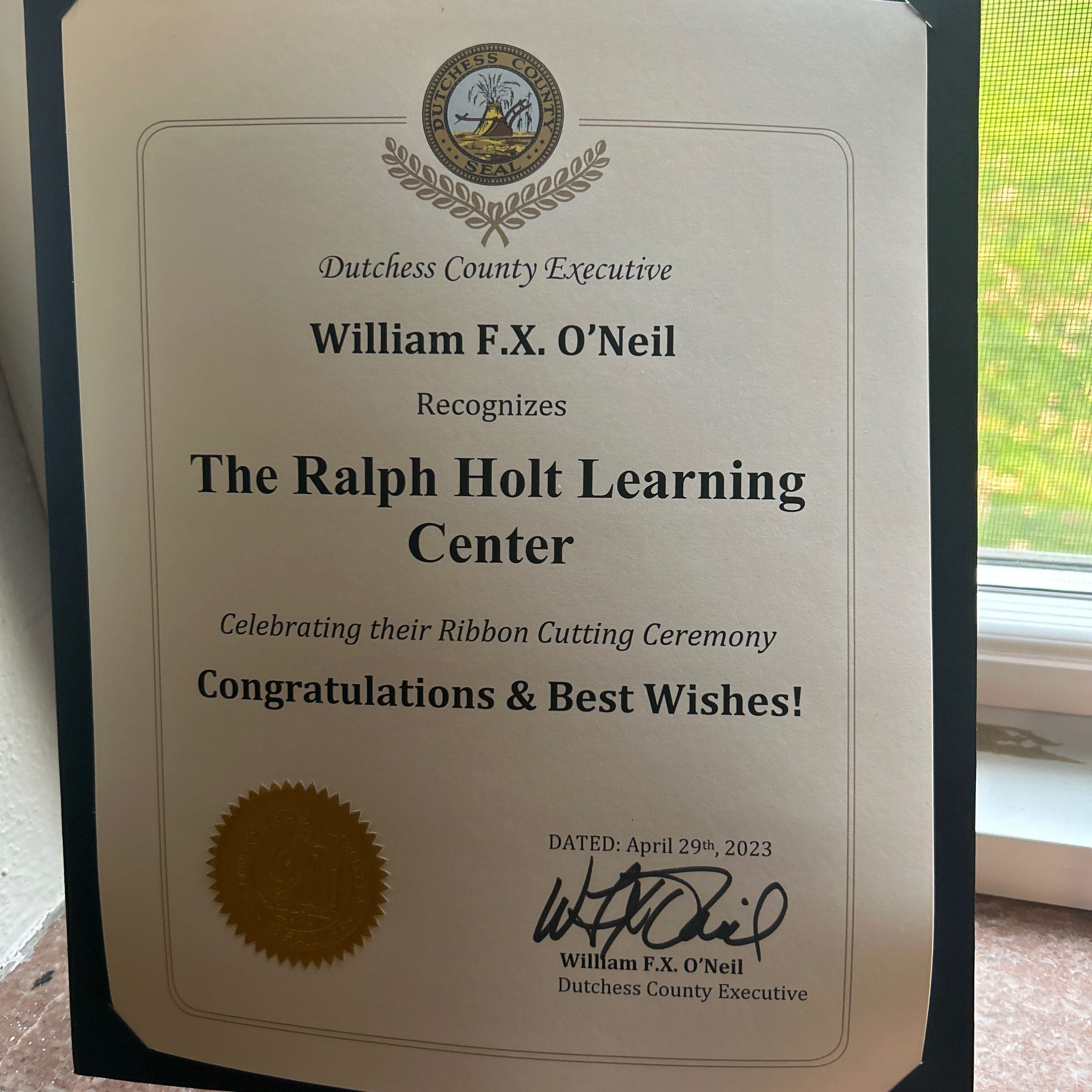 Certificate from Dutchess County Executive William FX O’Neil, recognizing The Ralph Holt Learning Center for celebrating their Ribbon Cutting Ceremony, October 29, 2023Inscription/Signature/Marks