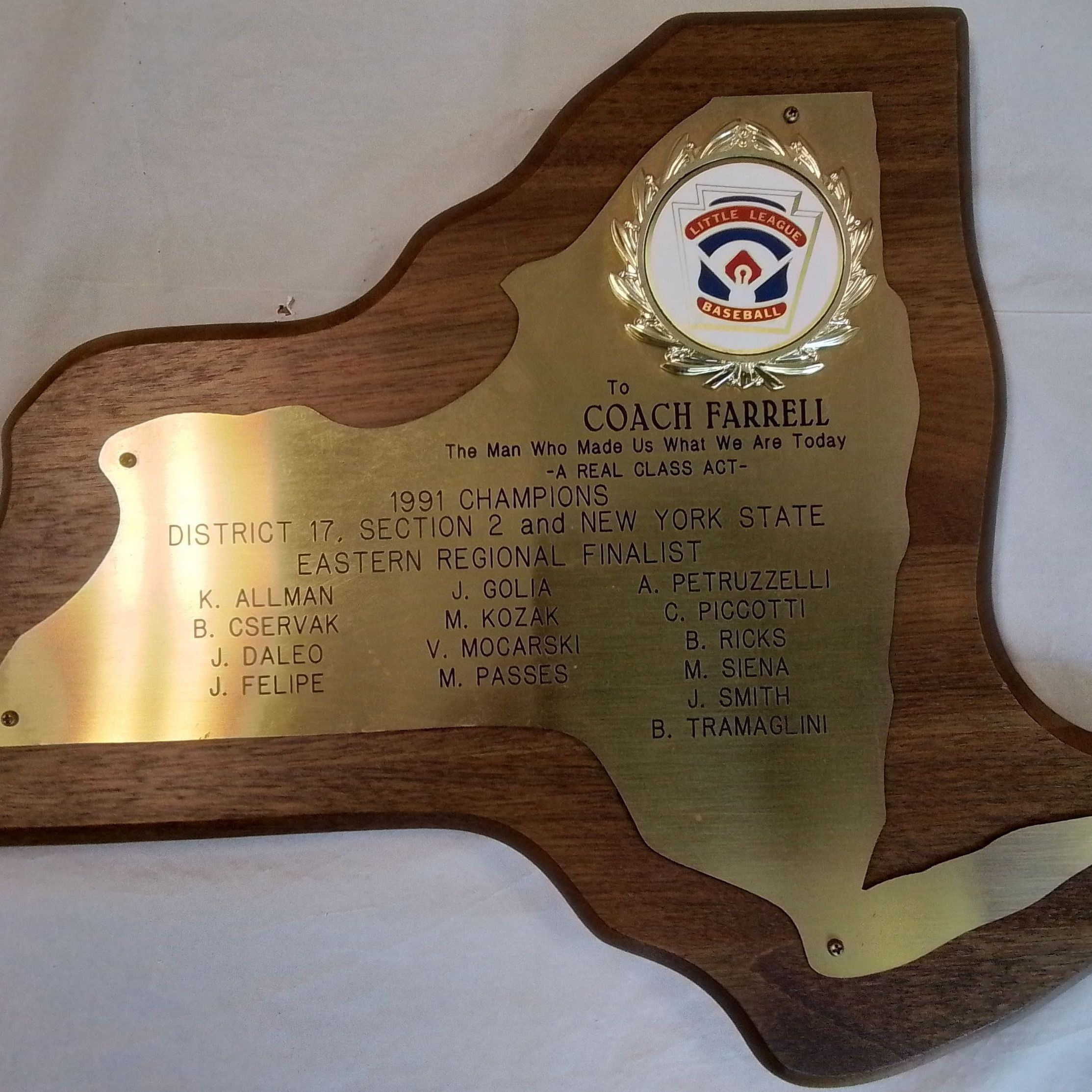A gift dedicated to Coach Farrell for his role in the 1991 NYS Little League Championship with a list of names of the players he coached.
