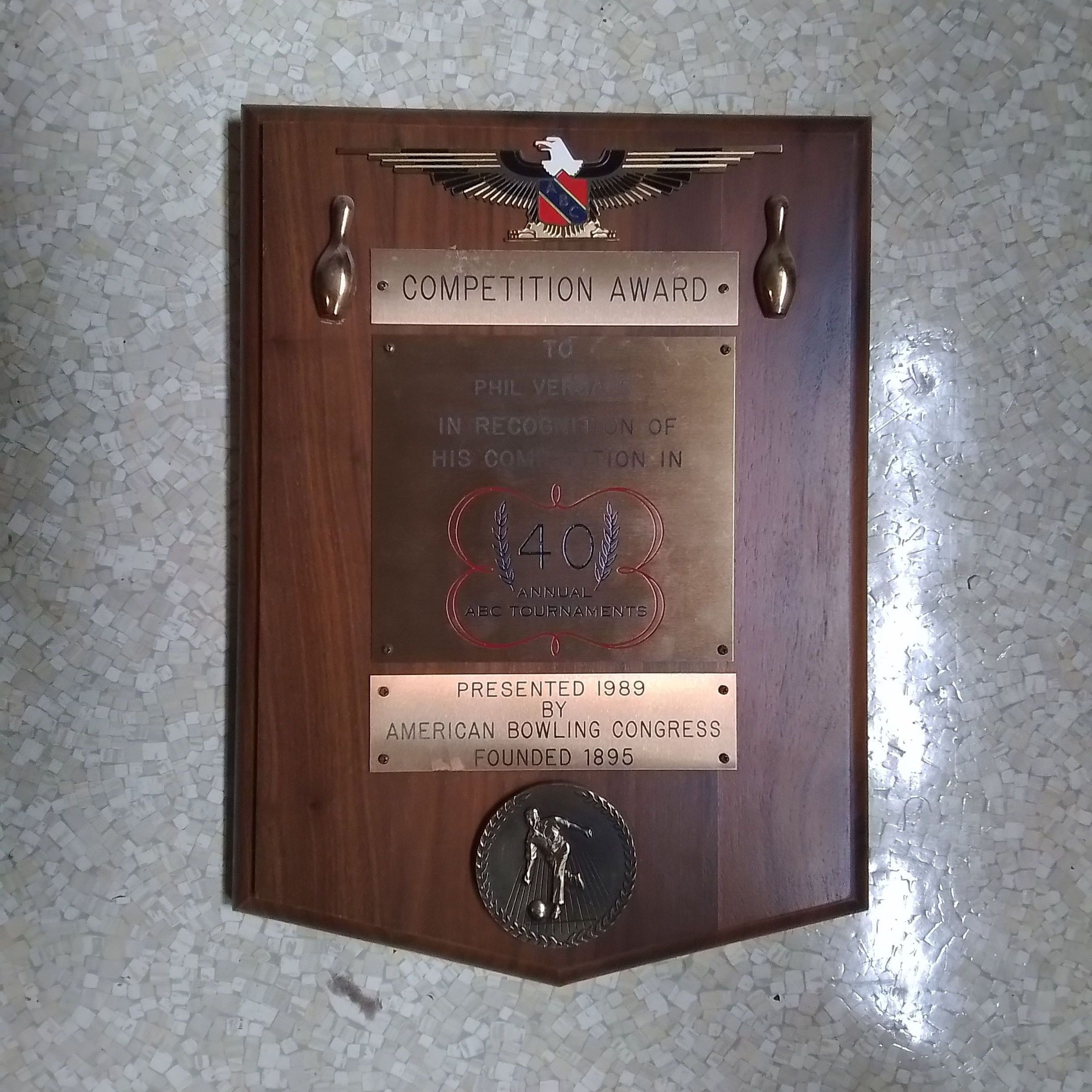 Competition award for Phil Versace dedicated for his participation in 40 annual ABC tournamentsEntry/Object ID