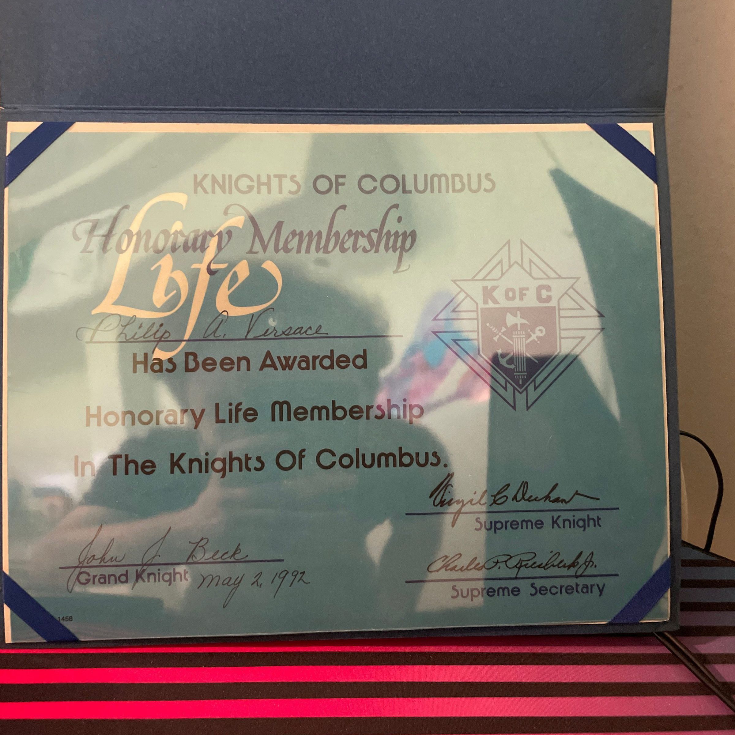 Knights of Columbus Honorary Life Membership. Phillip A. Versace Has Been Awarded Honorary Life Membership In The Knights Of Columbus. Signed: John Jay Beck. Grand Knight. May 2nd, 1992. Also Signed By KOC Supreme Knight and KOC Supreme Secretary.Dimensions