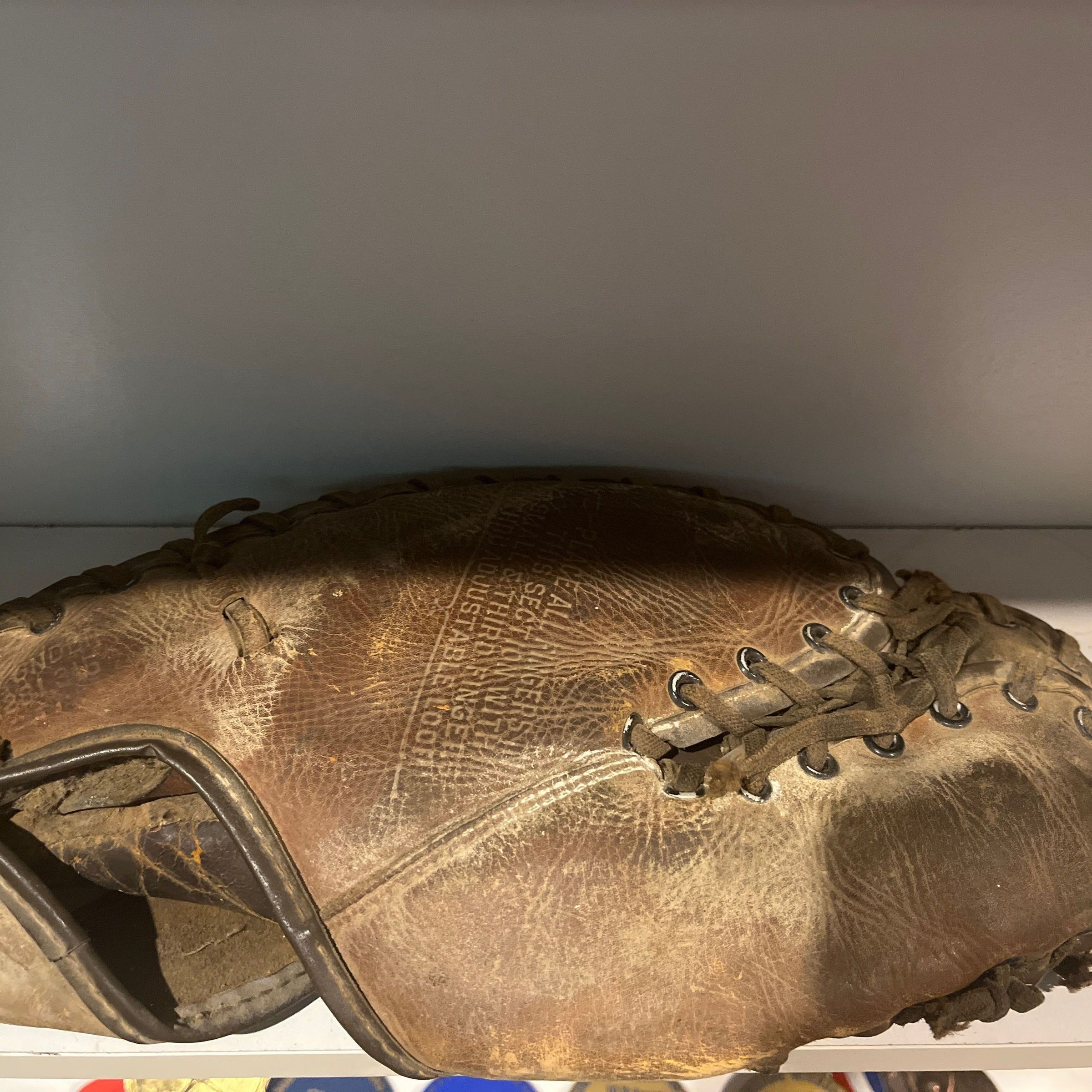 Appears to be a vintage baseball or possibly softball catchers mitt. Possibly from the mid 20th century or earlier.