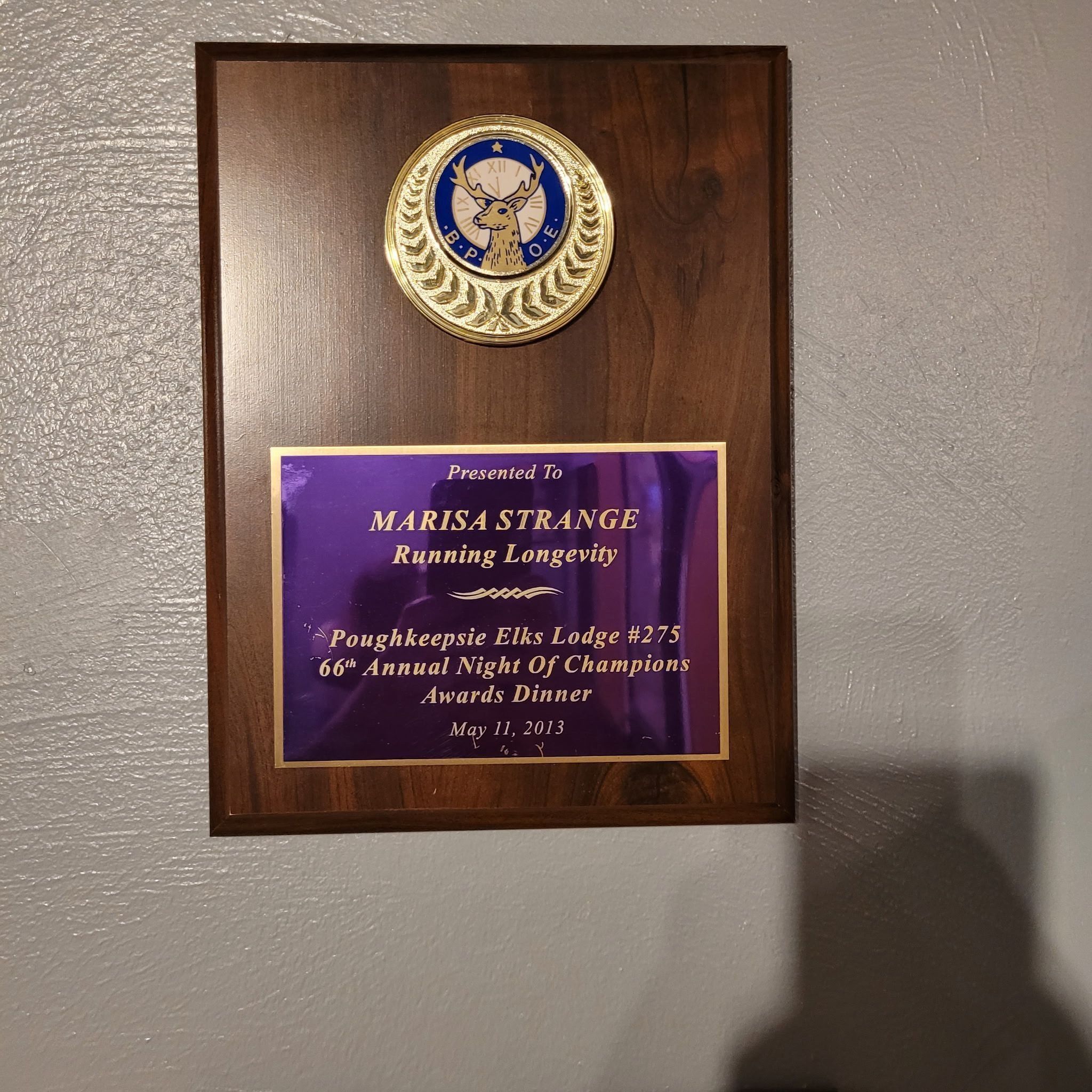 Poughkeepsie Elks Lodge #275 award given to Marisa Strange in 2013 at 68th Annual Night of Champions Dinner, for continued dominance in her sport.