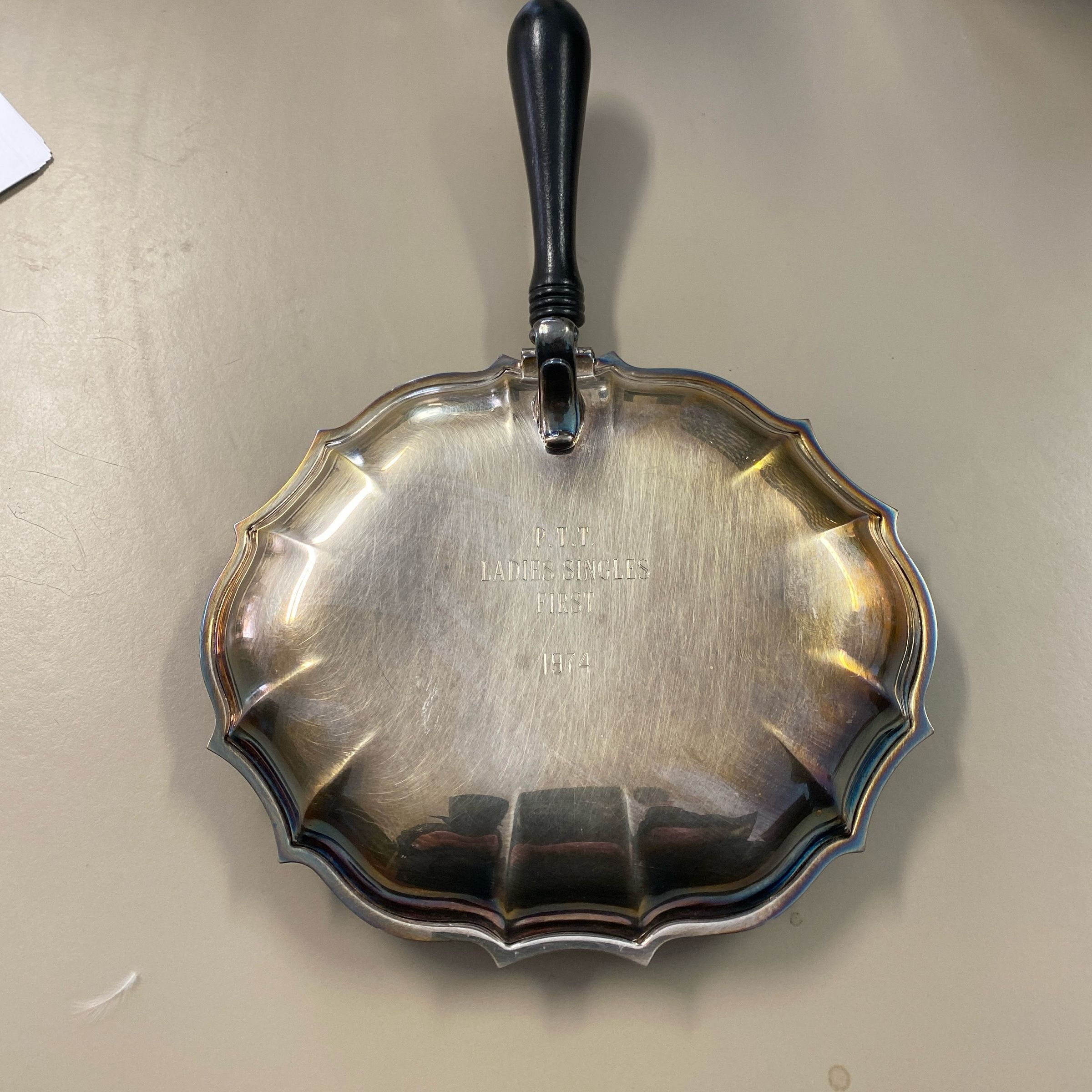 P.T.T Ladies Singles First Place Duster/ Trophy, awarded to Pat Zerbe in 1974