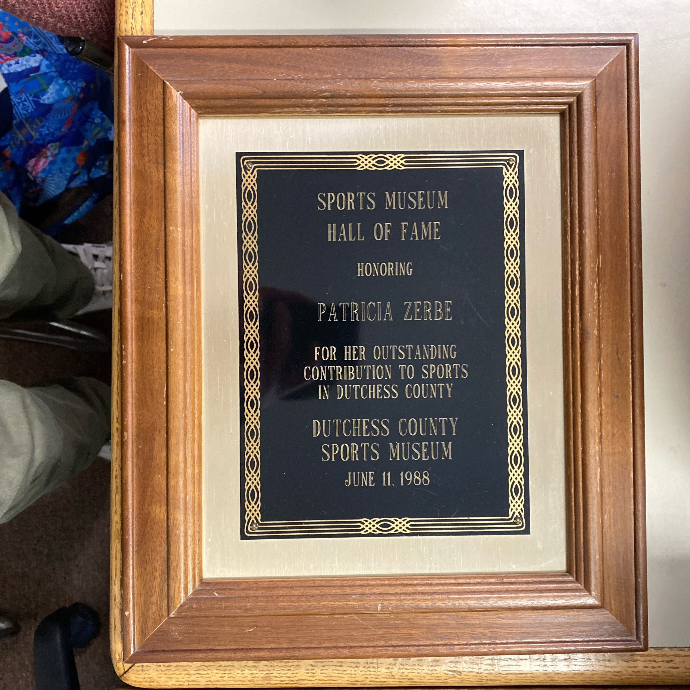 “Sports Museum Hall of Fame Honoring Patricia Zerbe for her outstanding contribution to sports in Dutchess county Dutchess County Sports Museum June 11, 1988Dimensions