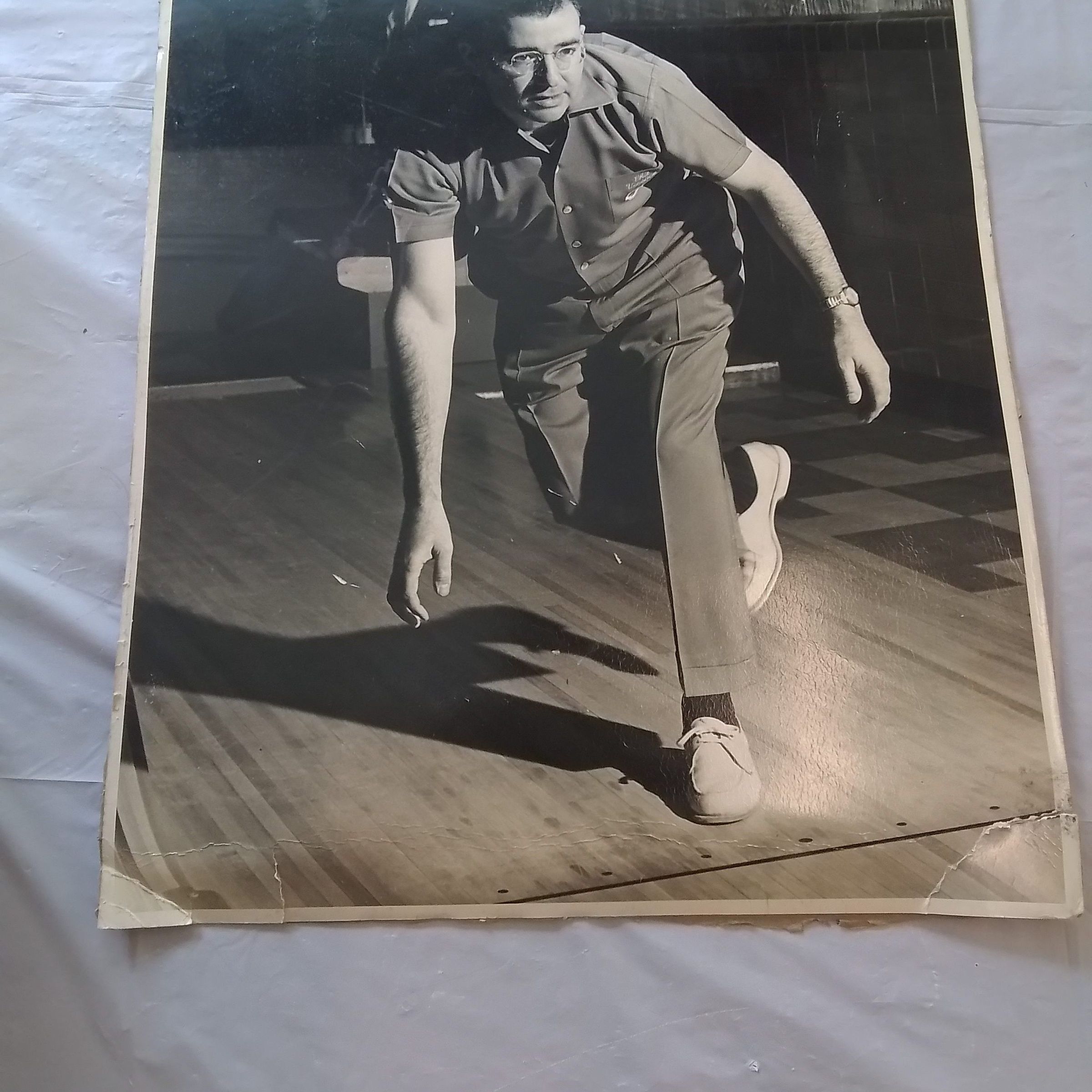 Black and white cardboard photograph of Phil Versace tossing a bowling ball.Collection