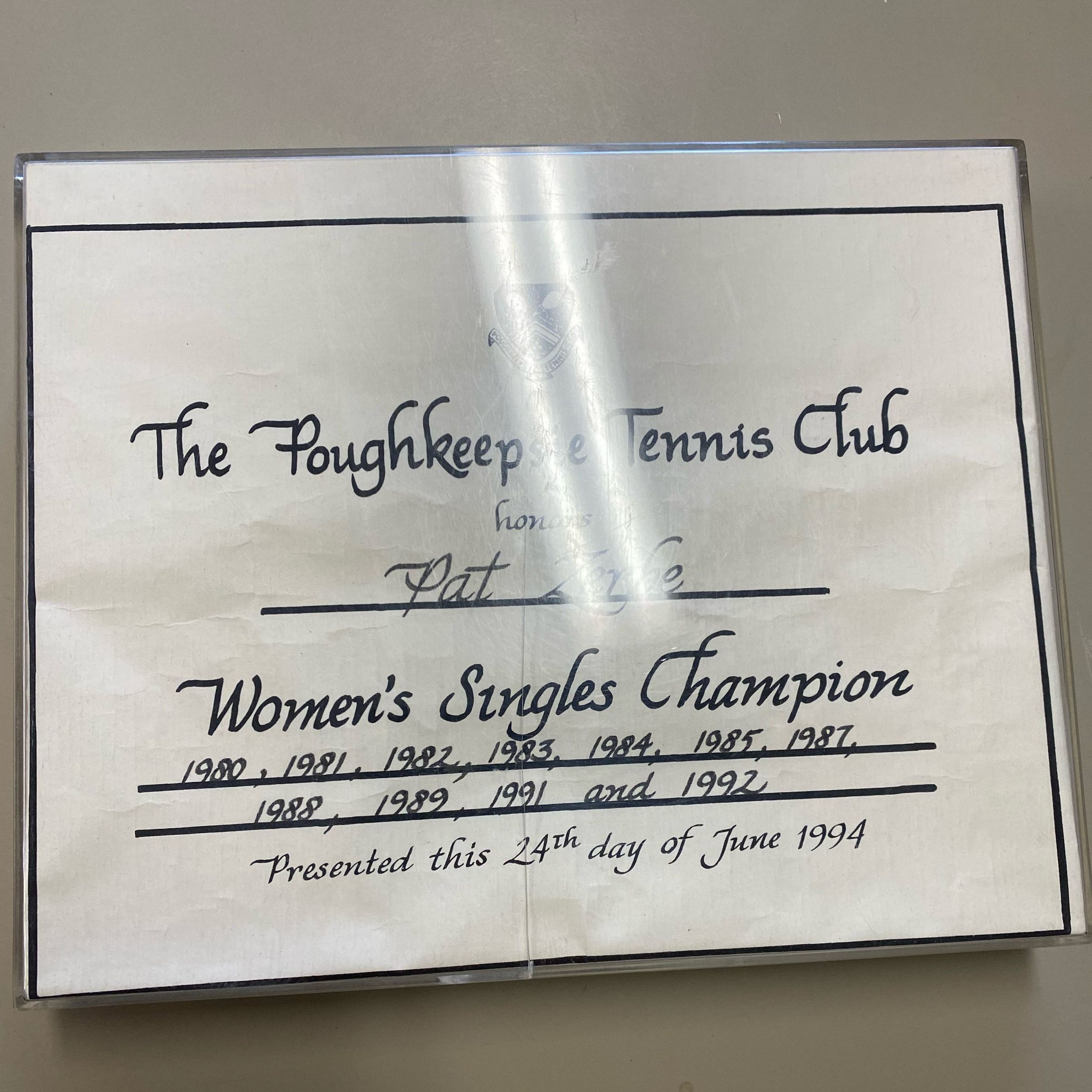 “The Poughkeepsie Tennis Club honors Pat Zerbe women’s singles champion 1980,1981,1982,1983,1984,1985,1987,1988,1989,1991,1992 Presented this 24th day of June 1994”