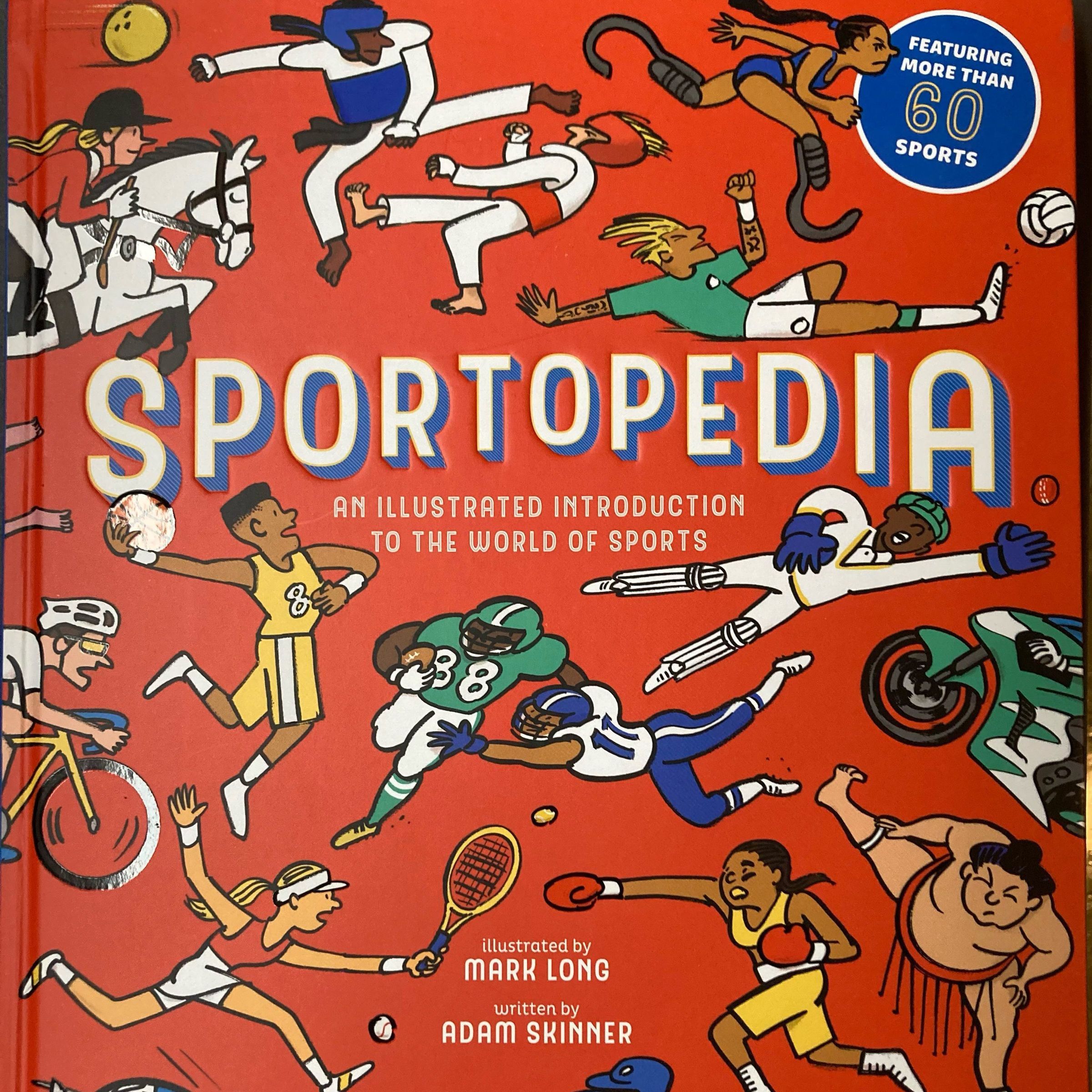 The front cover of Sportopedia, showing illustrations of all kinds of athletes participating in their sports.