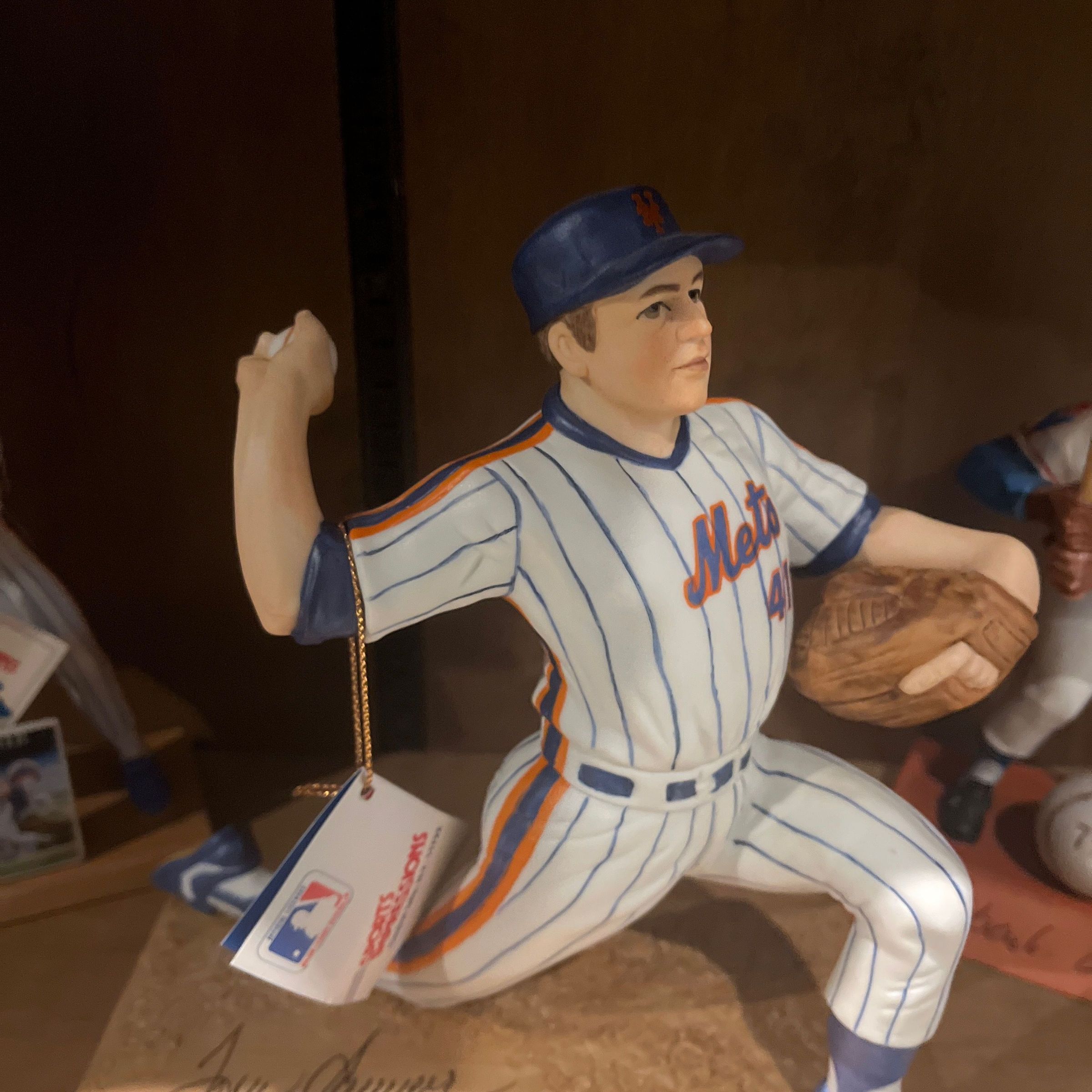 The figurine depicts Seaver, a Hall of Fame pitcher for the New York Mets, in his pitching motion while wearing the team's white pinstripe uniform with blue lettering. It is set on a wood base that features a facsimile of his signature.Collection
