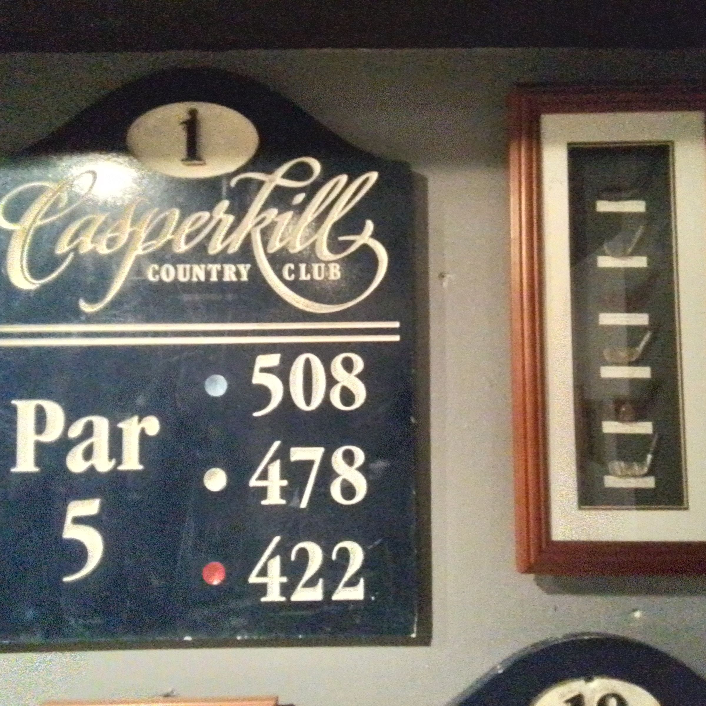 Golf sign for hole one of Casperkill Country Club, and golf club heads