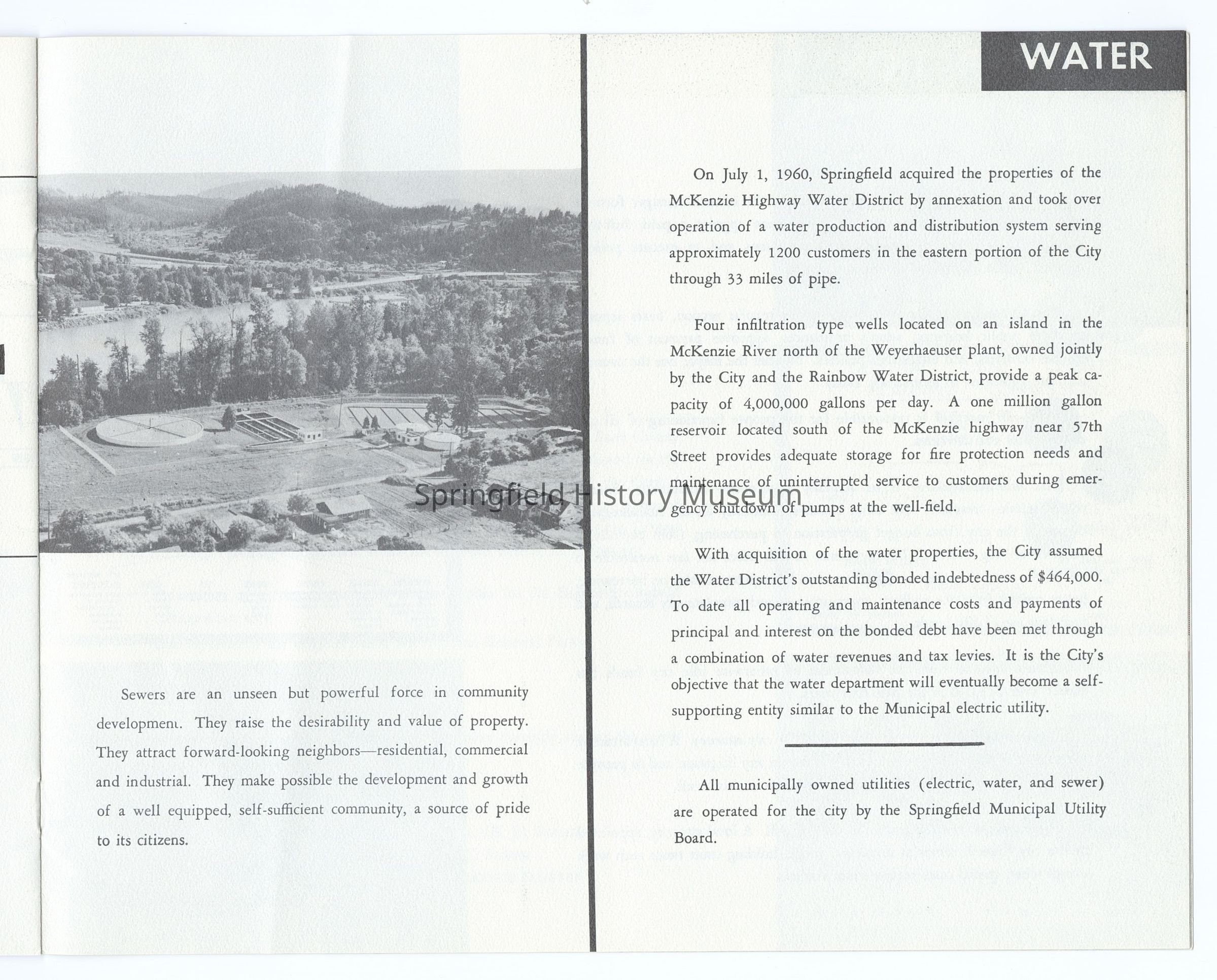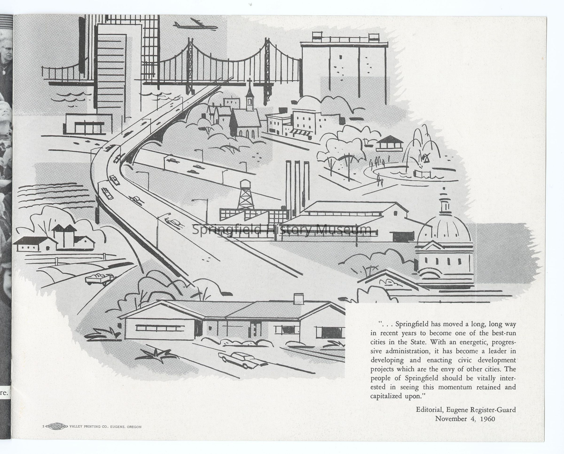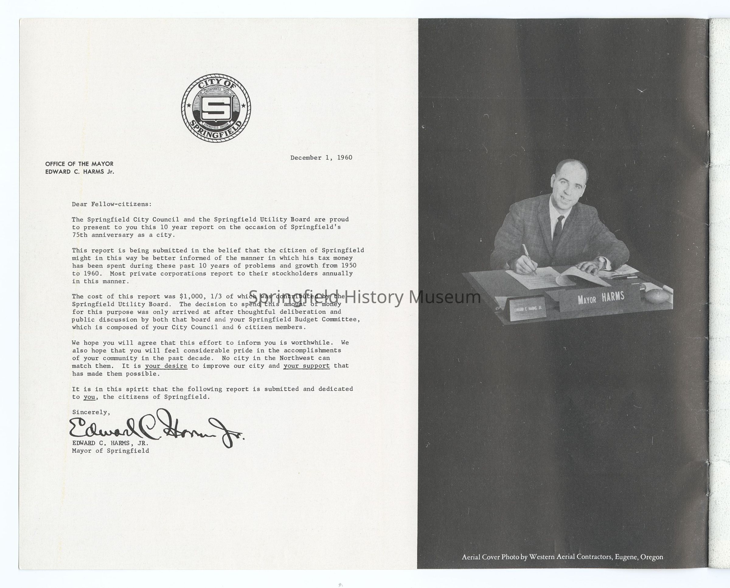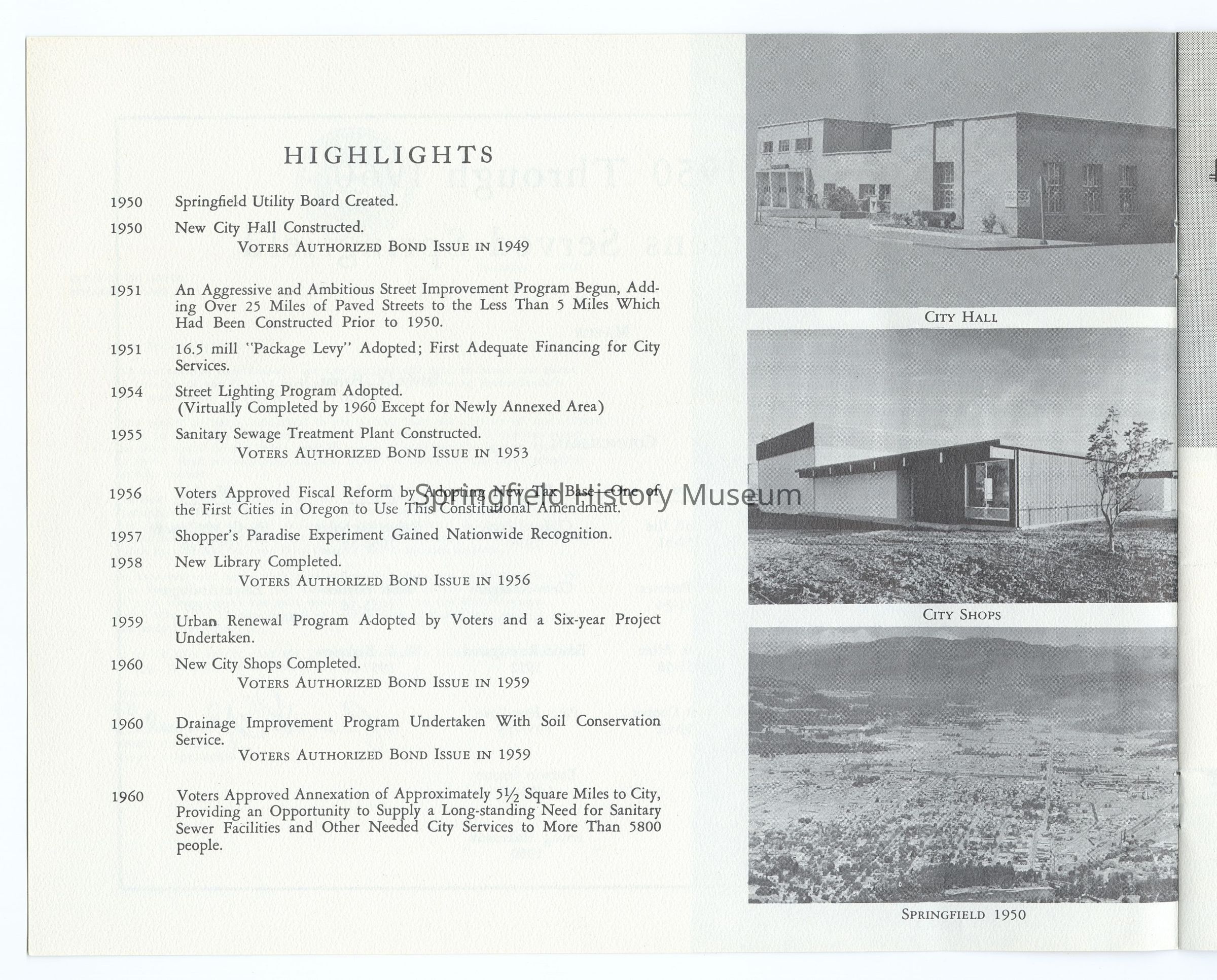 10 Year Progress Report on Springfield, Oregon, 1950-1960, compiled by the City of Springfield and the Springfield Utility Board on the occasion of Springfield's 75th anniversary as a city. Appr. 20 pages.Context