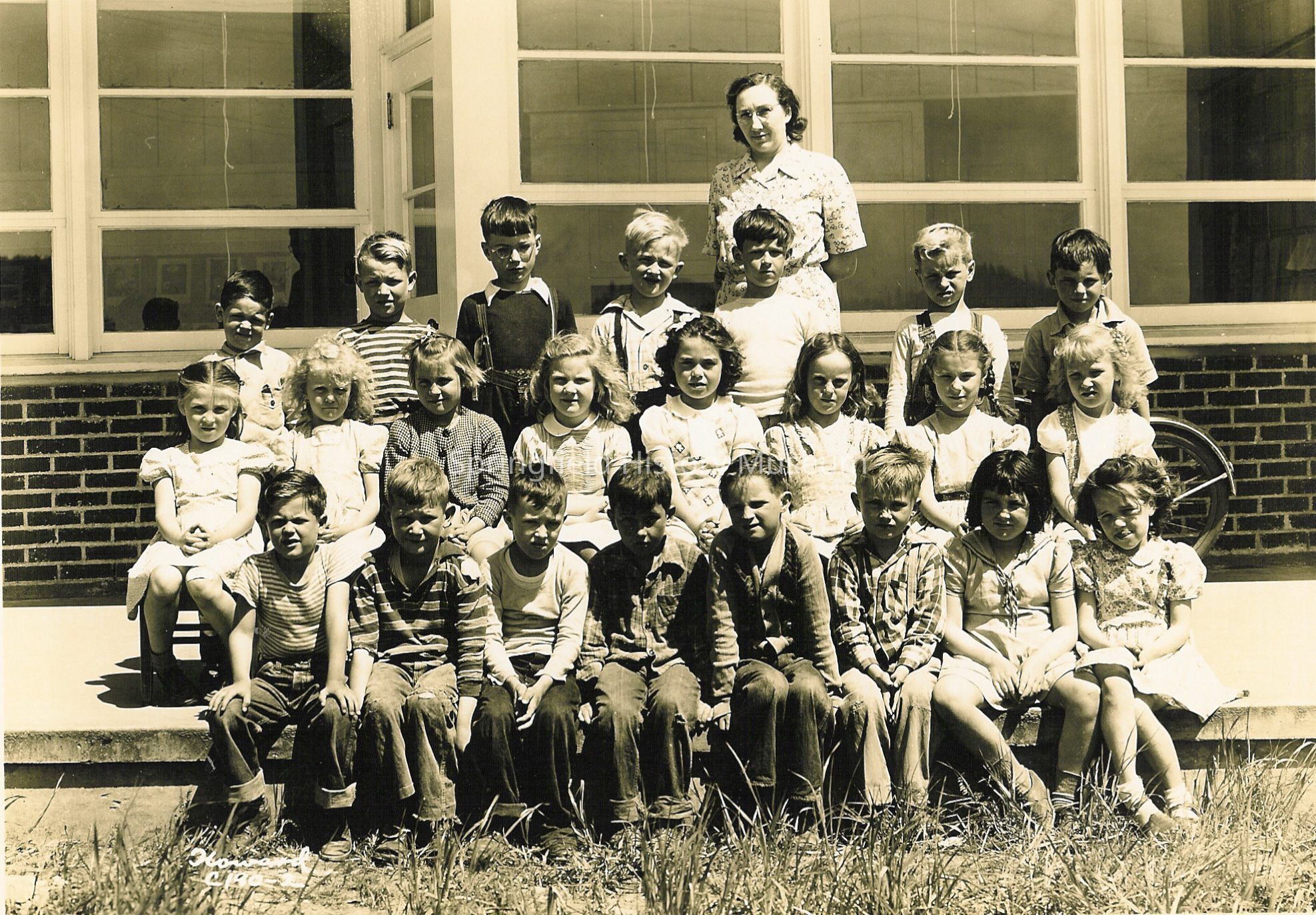 Photograph of Maple Elementary School class photo. Photo shows three rows of students on sidewalk [front row seated on sidewalk] with an older teacher standing back center. Twenty-three students. Marked Howard C190-2.Photograph Details