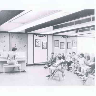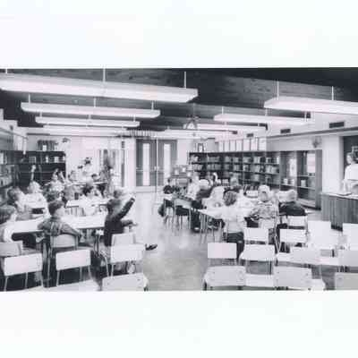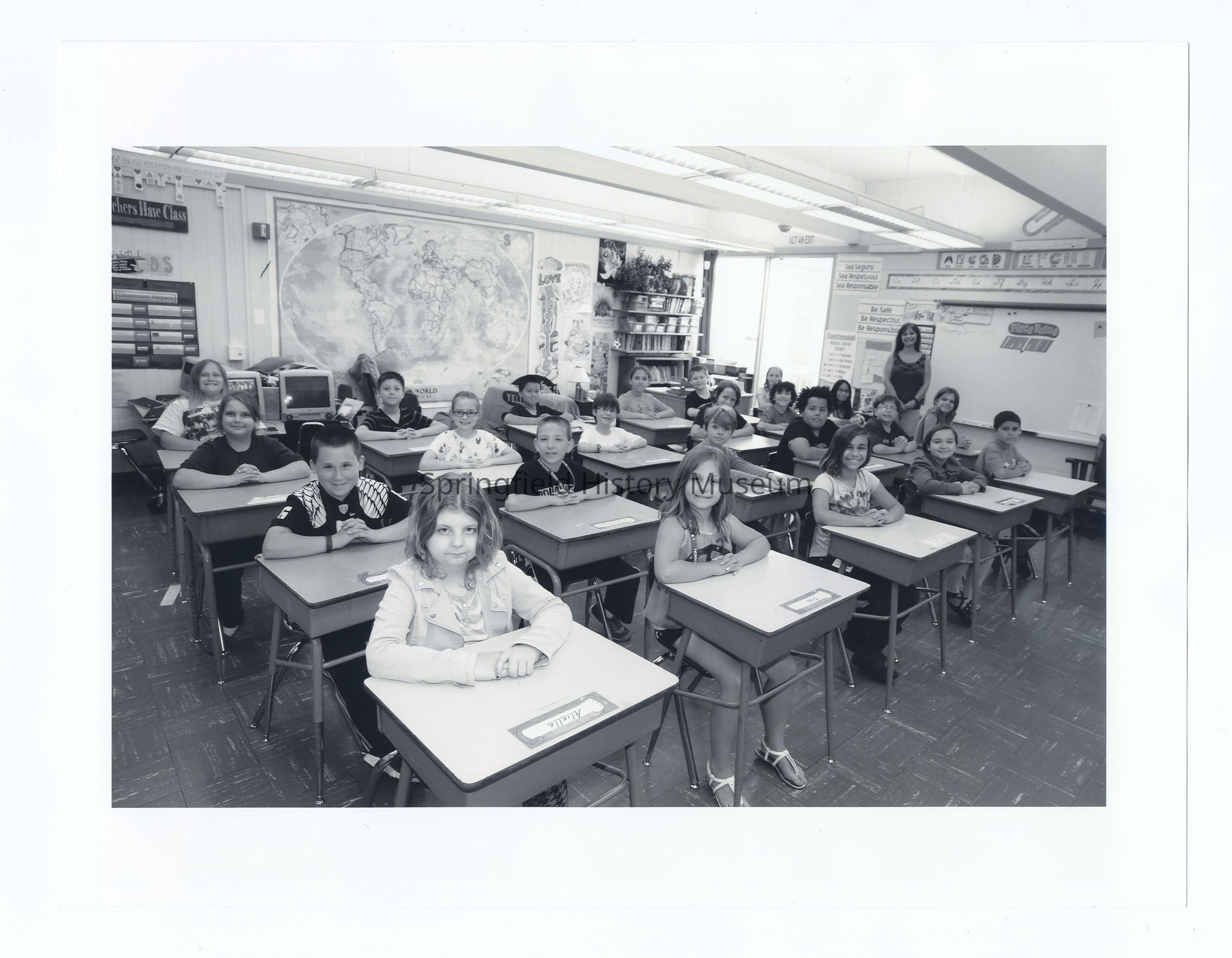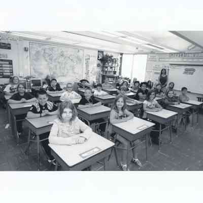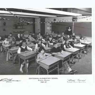 Photographs of Centennial Elementary School, circa 1960. 8 photographs showing building, gym, library, music room, 1966-67 5th and 6th Year Class (Miss Torres) and early 2000s recreation of previous class photograph.Photograph Details