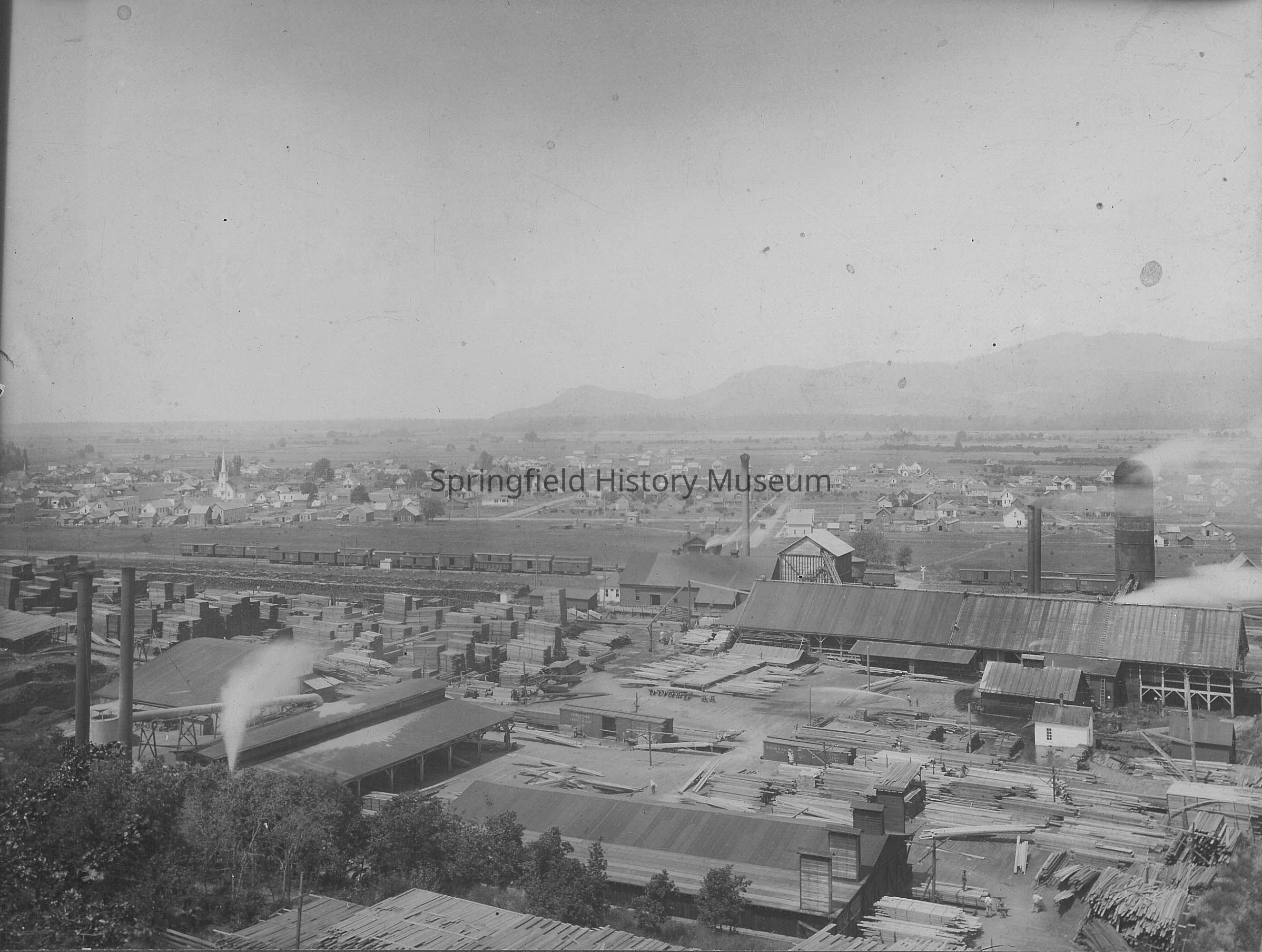 Photograph of early view of first Booth-Kelly mill and area looking north. View shows a lumber yard, boxcars on the railroad tracks, and the city of Springfield. Original
