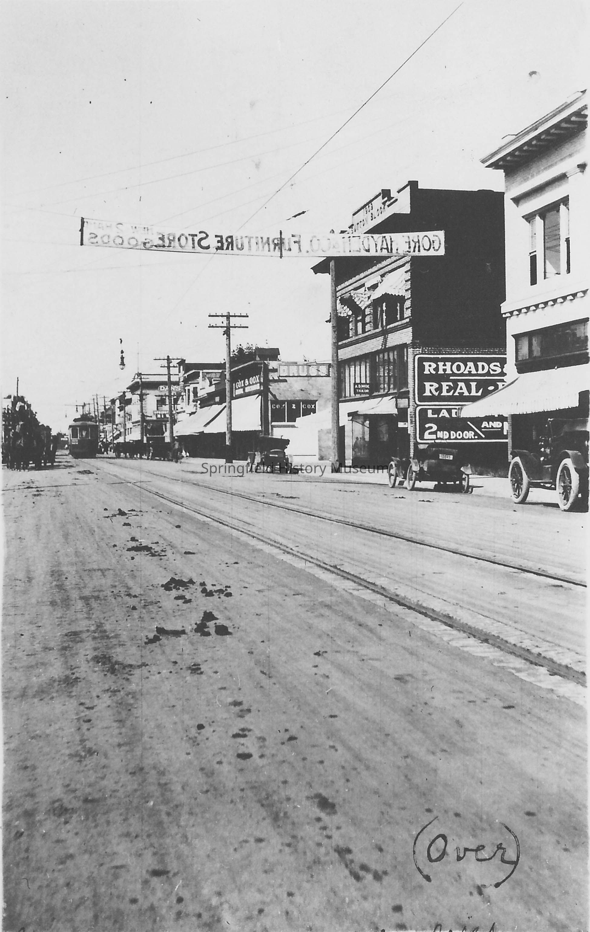 Photograph of Main Street and a streetcar coming down a paved road. Sign on right side of photo is for Rhoads Real Estate, Springfield, Oregon. UndatedPhotograph Details