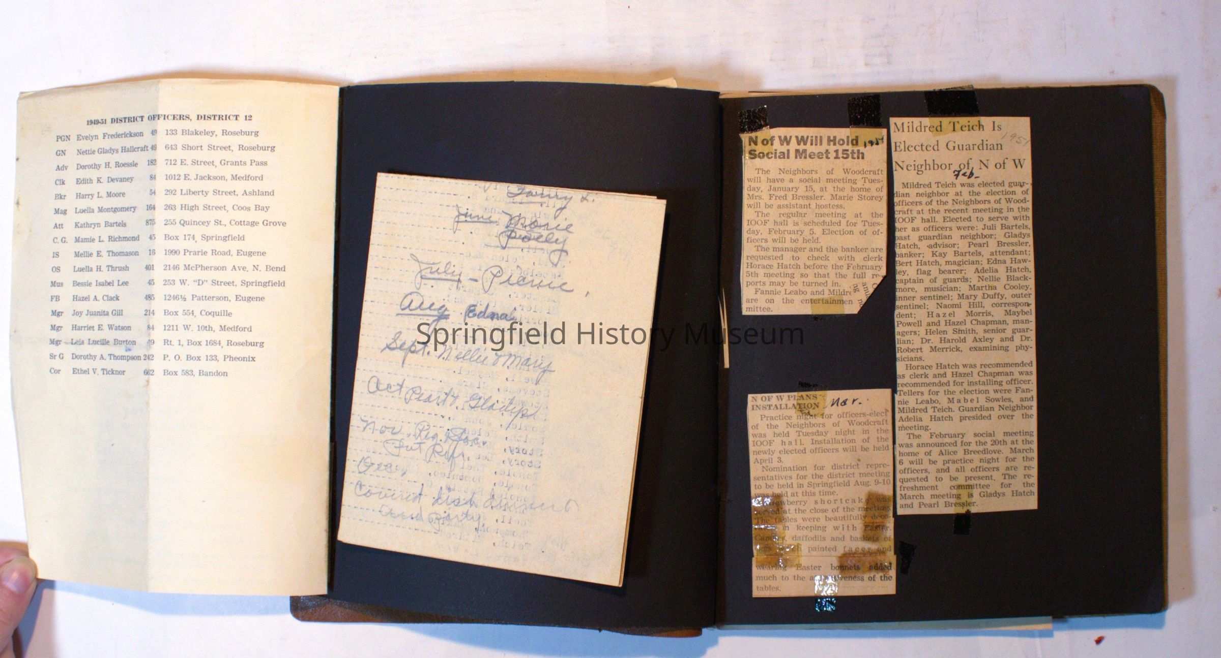 Scrapbook with leather cover. Contains donor's collection of clippings and mementos of Neighbors of Woodcraft activities.Acquisition
