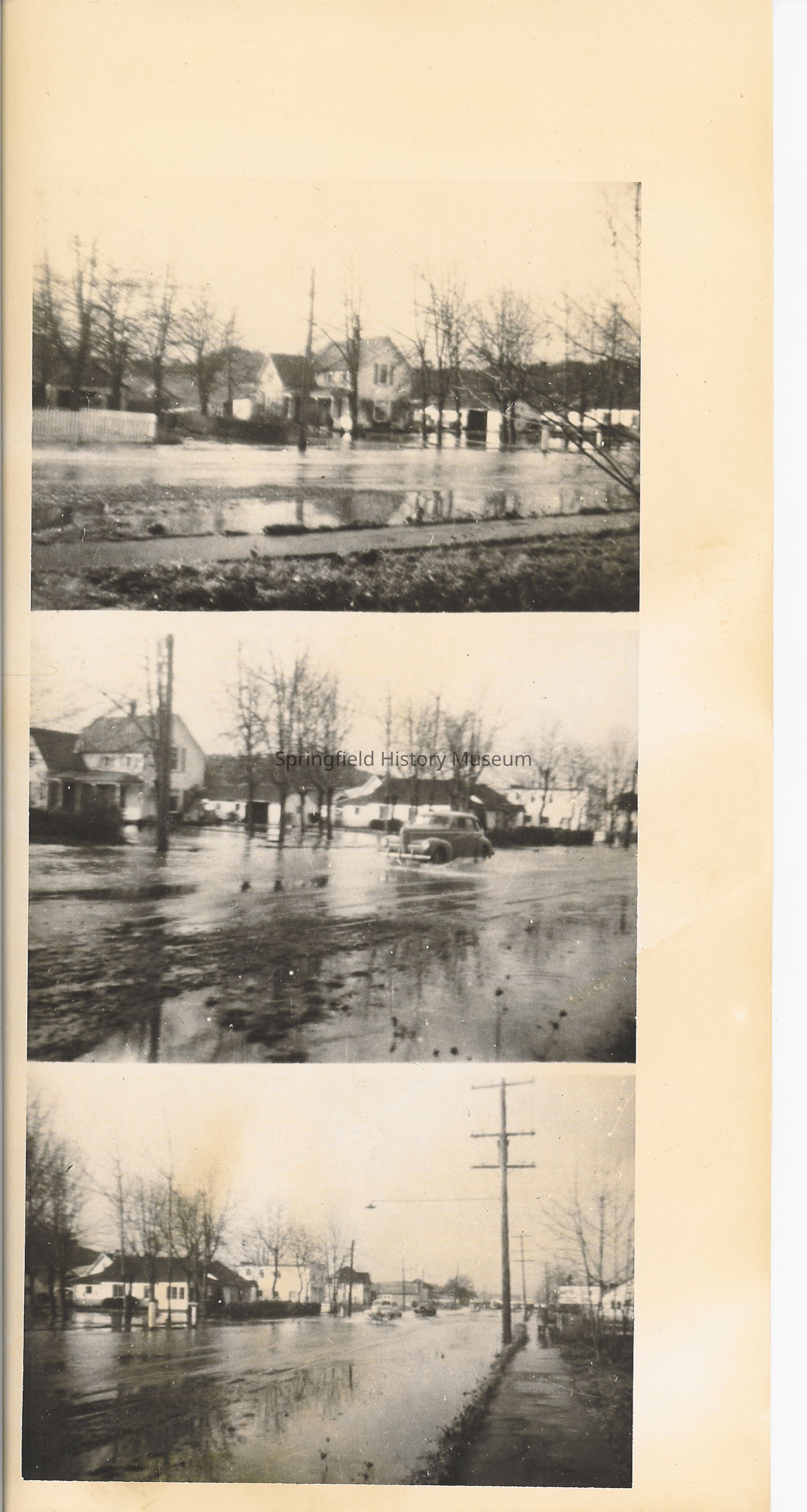 Top picture: flooding with trees and houses in background. Center photo: Car driving through flood with houses and trees in background. Bottom photo: flood with cars driving by trees and houses on left side. undated, 3 in 1 photo.Collection