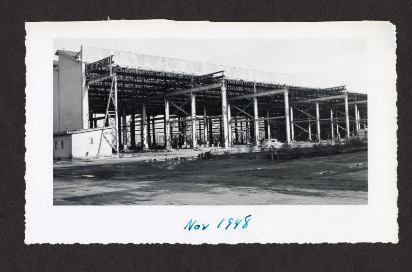 Photograph of crane shed in area no. 3 with a car infront of it, on bottom in pen: "Nov 1948"
